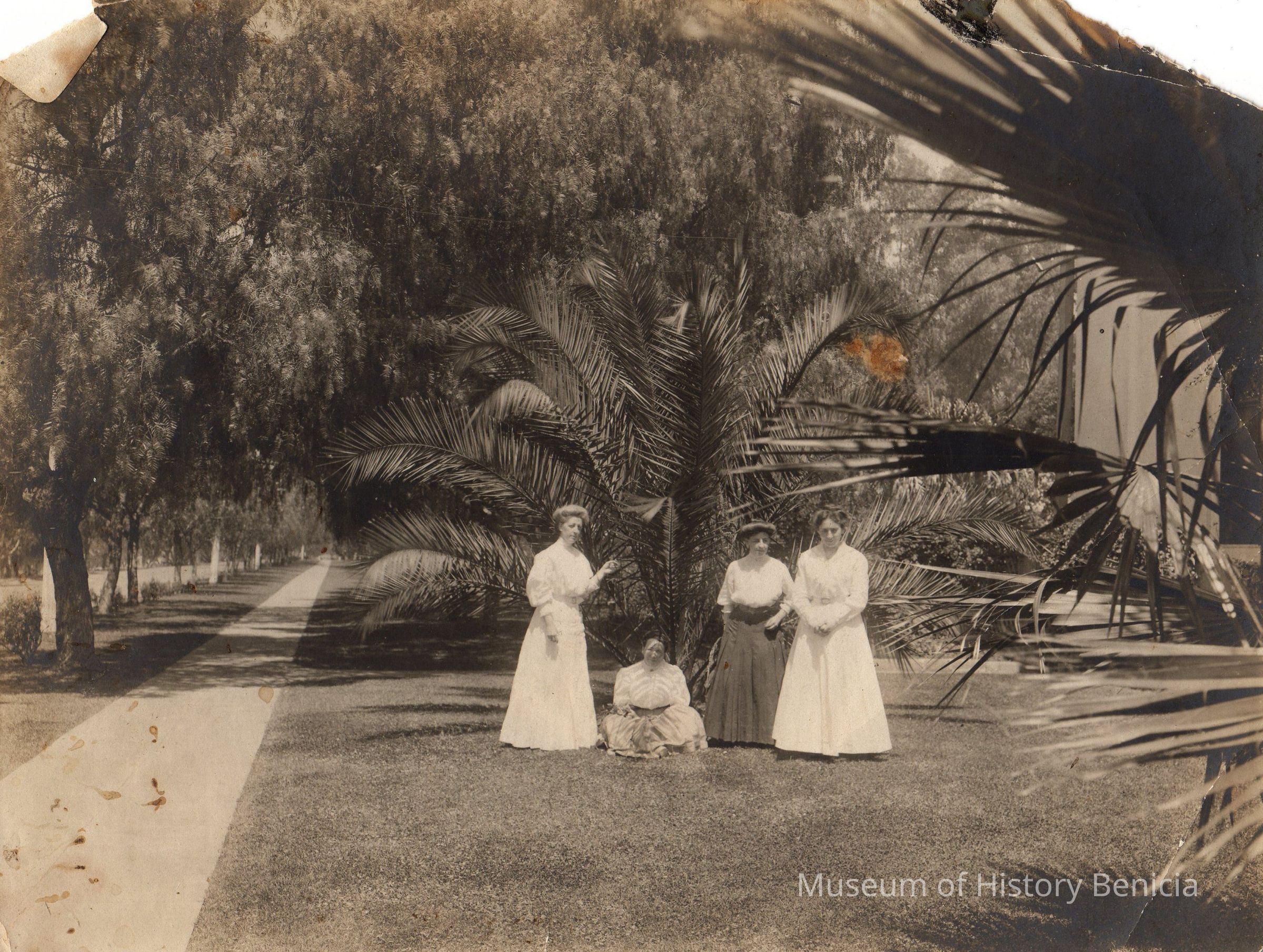 B/W photograph shows four women posing on the lawn near Officers' Row, three are standing and one is seated on the lawn near a palm tree