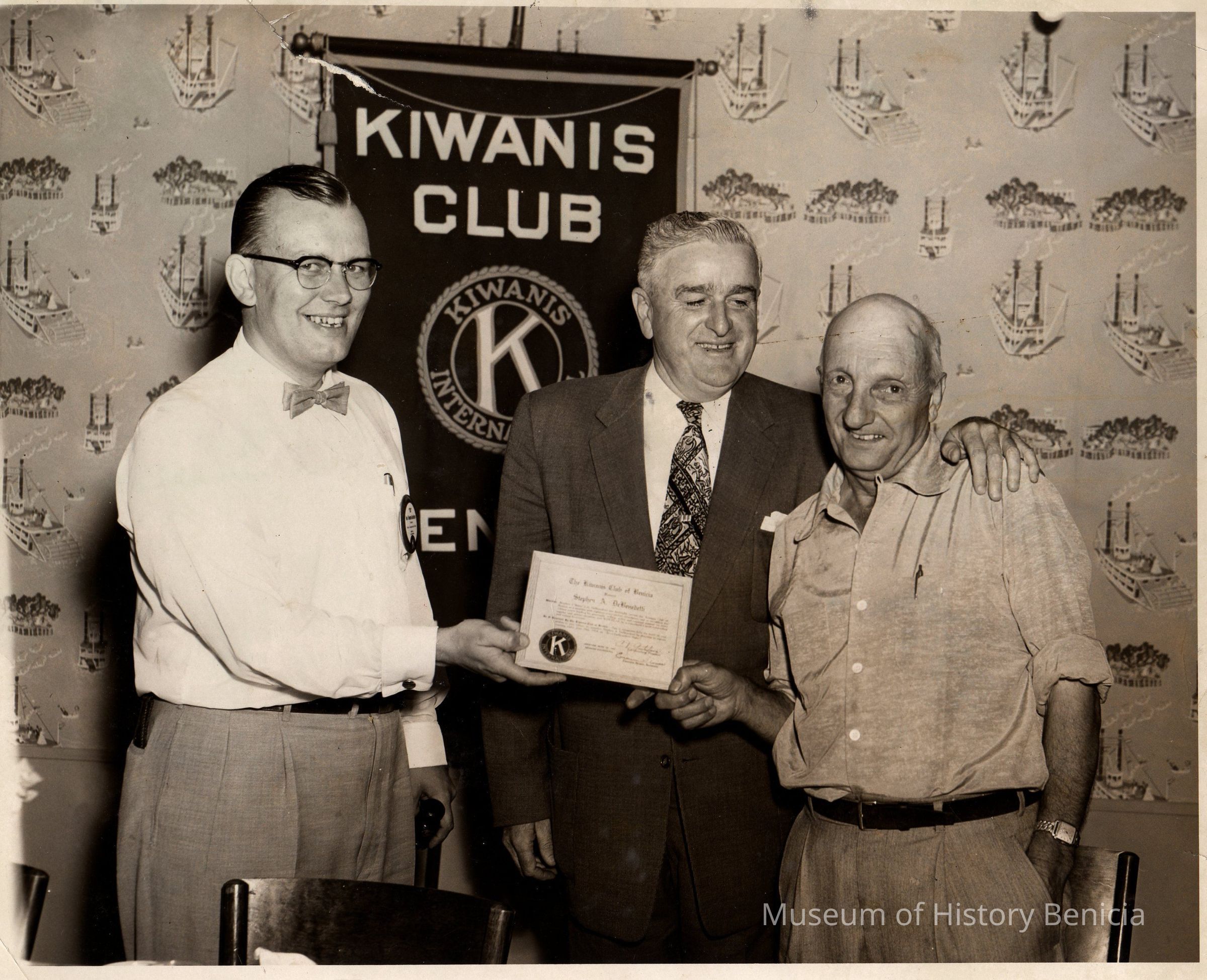 B/W photograph with caption: L to R Ted Gustafson President of Benicia Kiwanis Club, Walter Dusty Mails, personnel director of the San Francisco Seals and the honoree on his special night, Steve DeBenedetti, at Spenger's Grotto aboard the old ferry Encinal on Juyly 9, 1954.