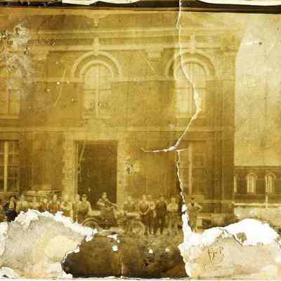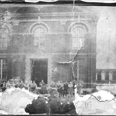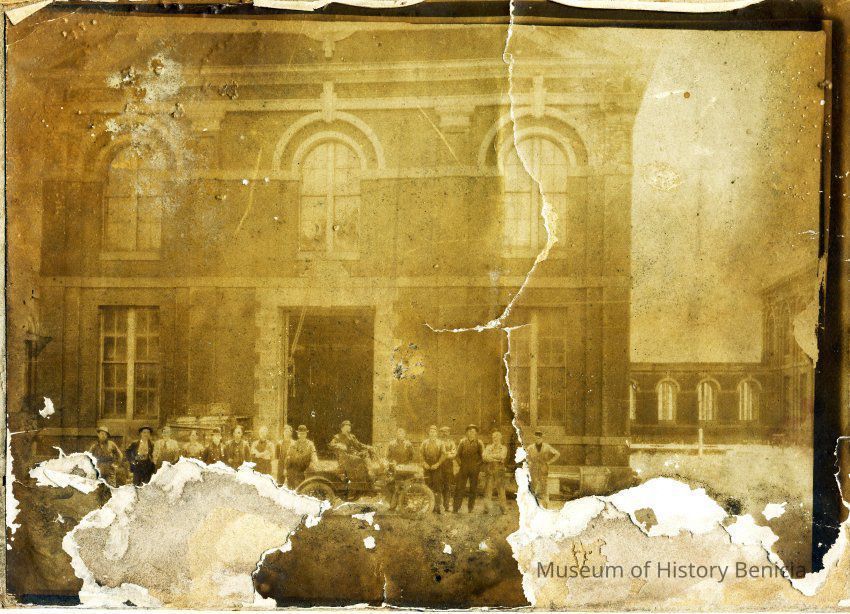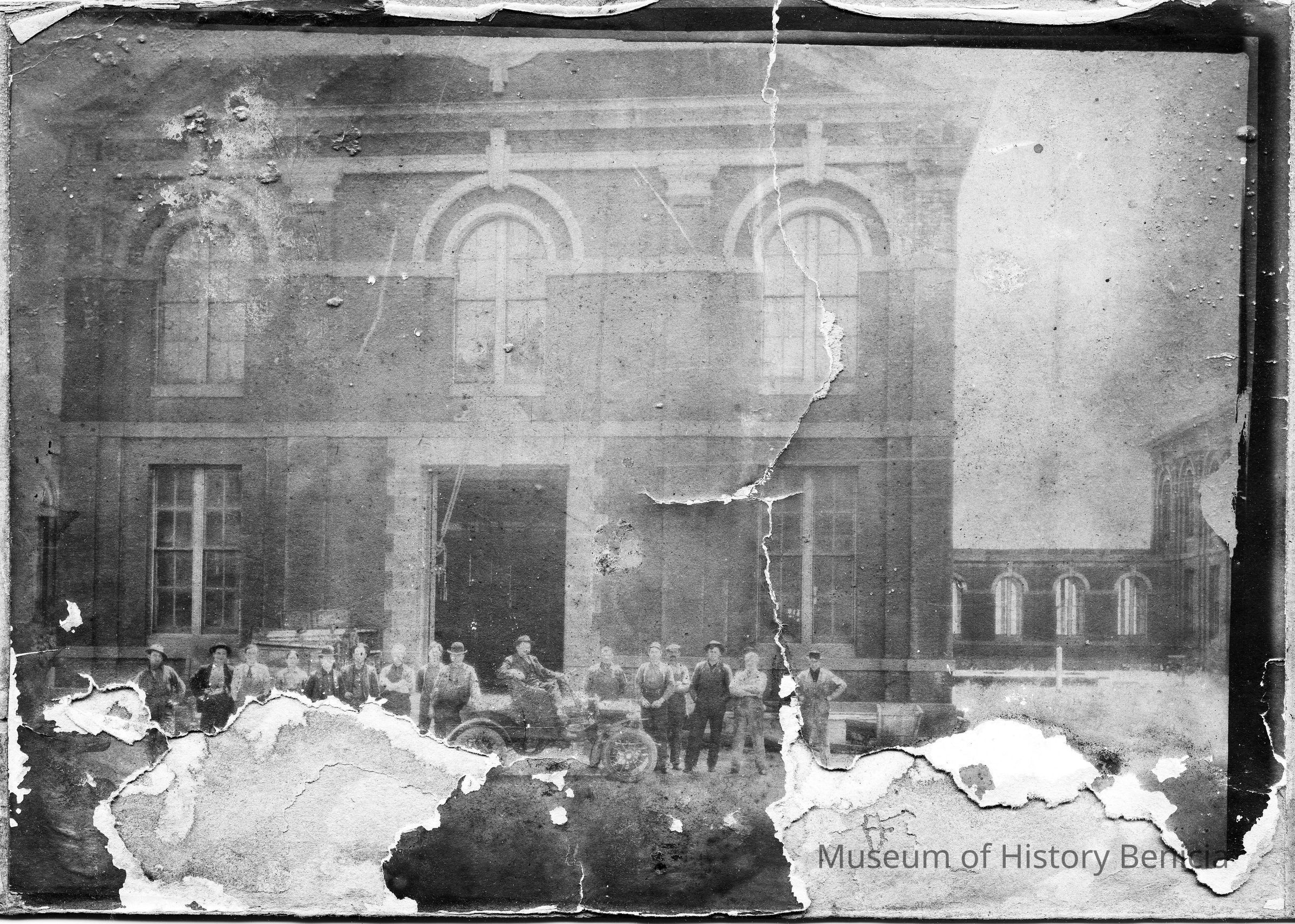 B/W photo of the building in Benicia Arsenal with a group of men in front. One man has a car. On the back it says "One of the buildings at Benicia Arsenal about 1910 See the old Reo in front of Bldg."