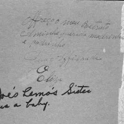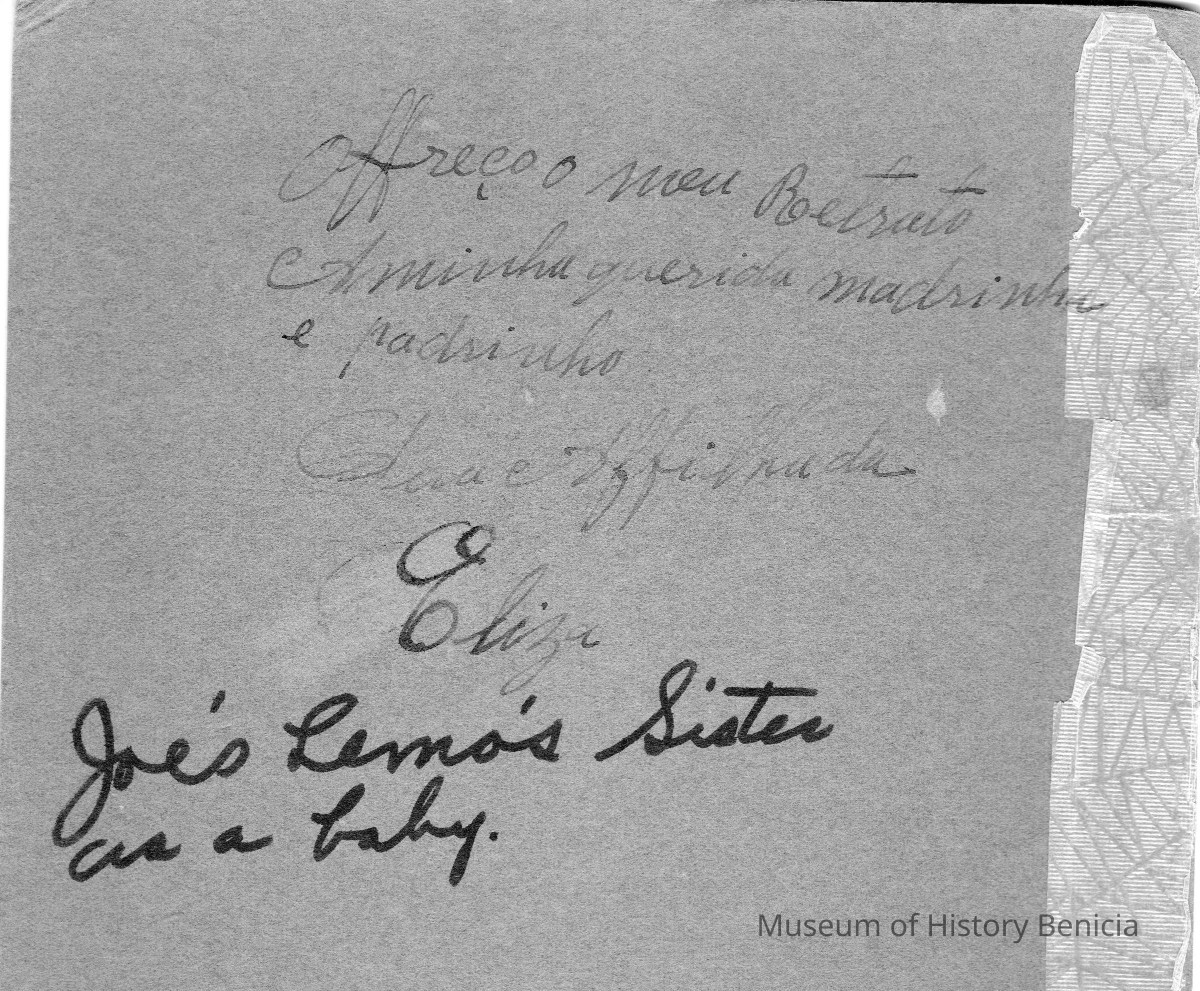 Studio photo of a baby. On the back is written something probably in Portugese. Also in another hand it says "Joe's Lemo's Sister as a baby".Collection