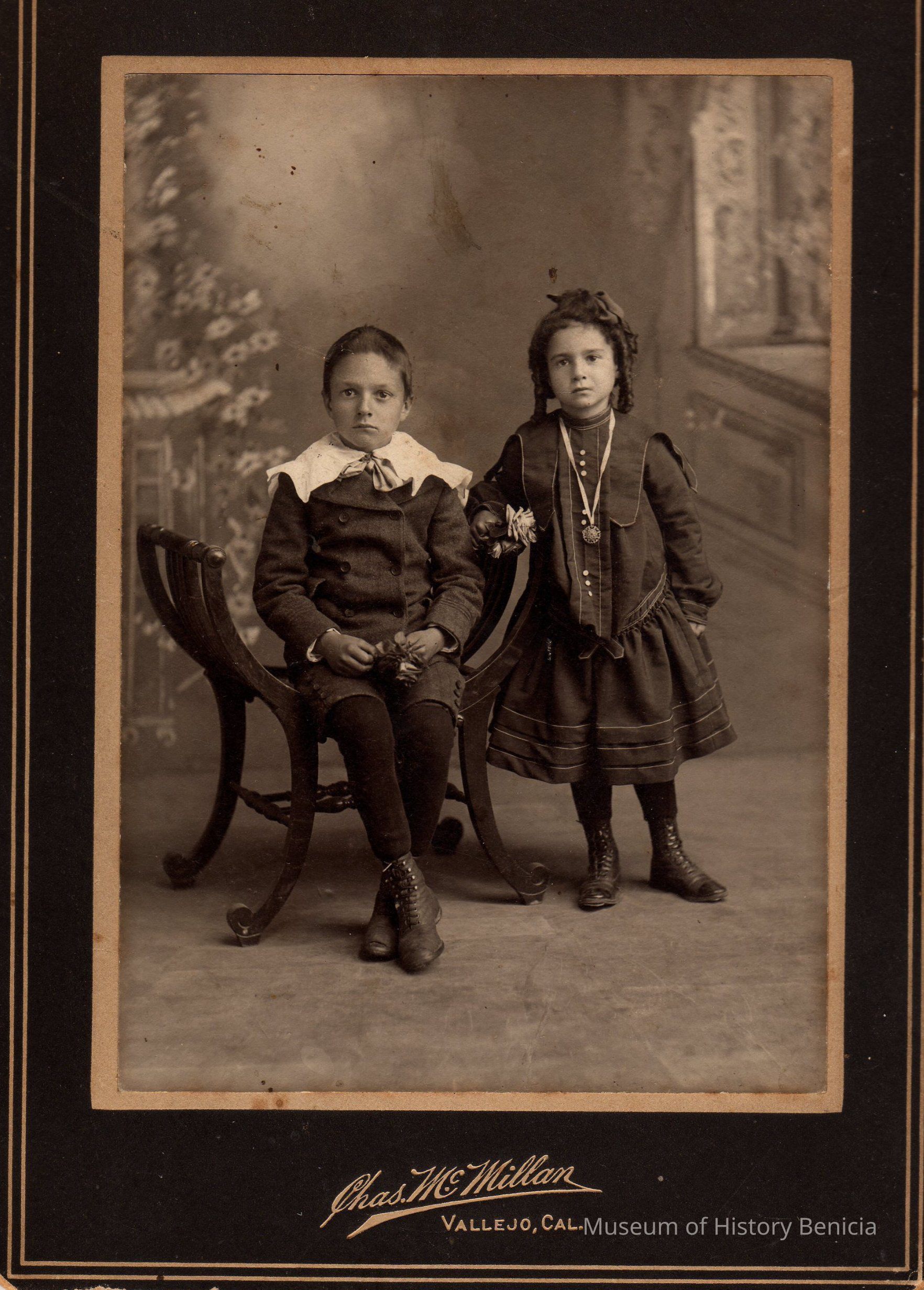 B/W photograph of Loretta and Steven DeBenedetti as children glued to cardboard backing