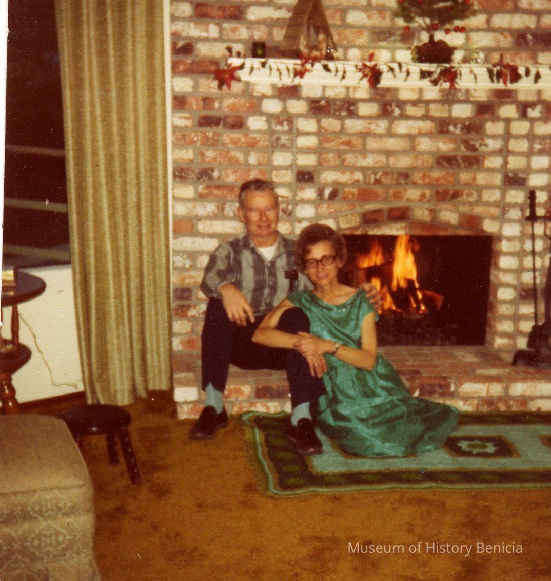 color photograph of Lillian Eggen and her husband: shows a man and woman sitting in front of a brick fireplace - date and location unknownCollection
