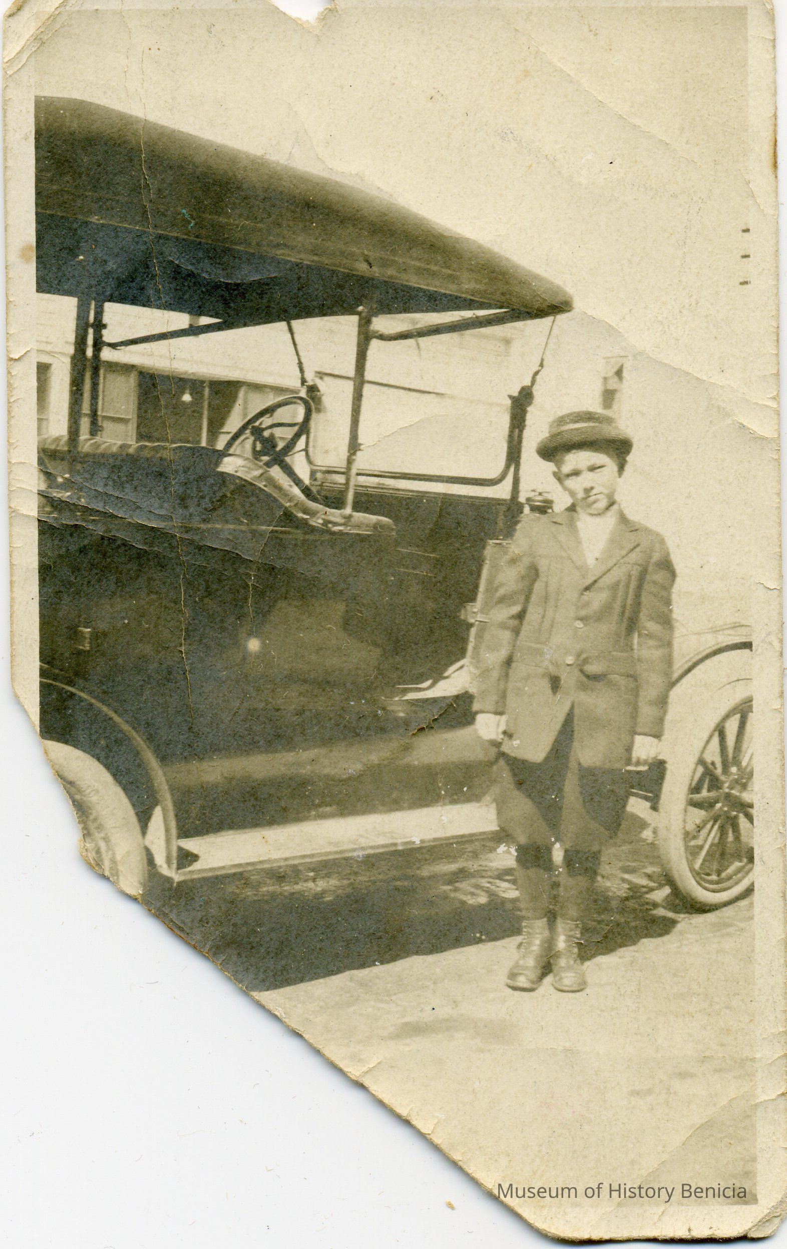 A photo of a boy next to an old car. The boy is wearing nickers. The corner of the photo is cut off.