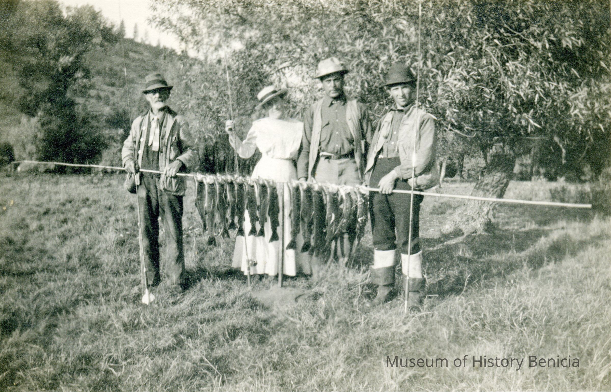 A photo of men and a woman with a string of fish.