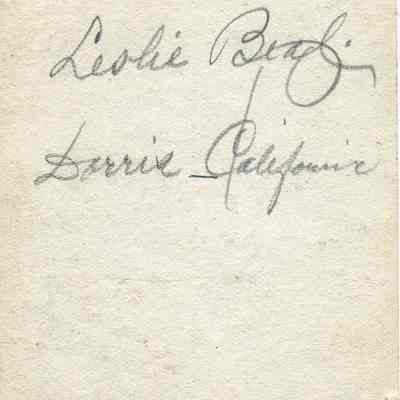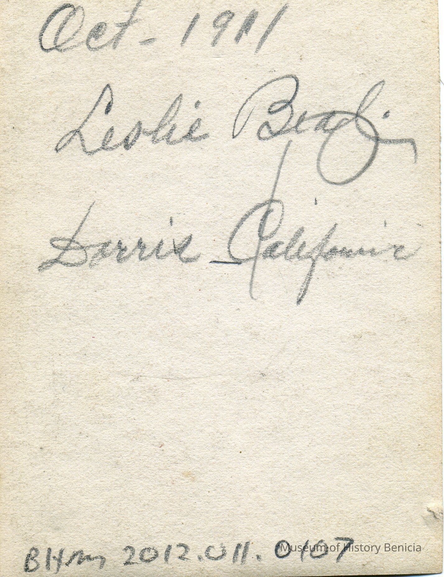 A photo of asmall boy with a big hat. On the back it says"Oct 1911 Leslie Beal Dorris California".