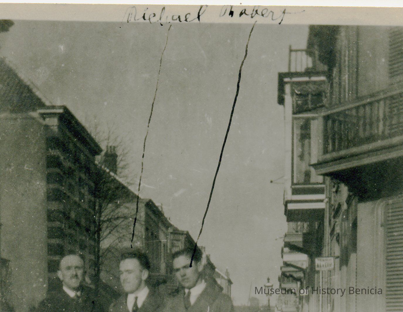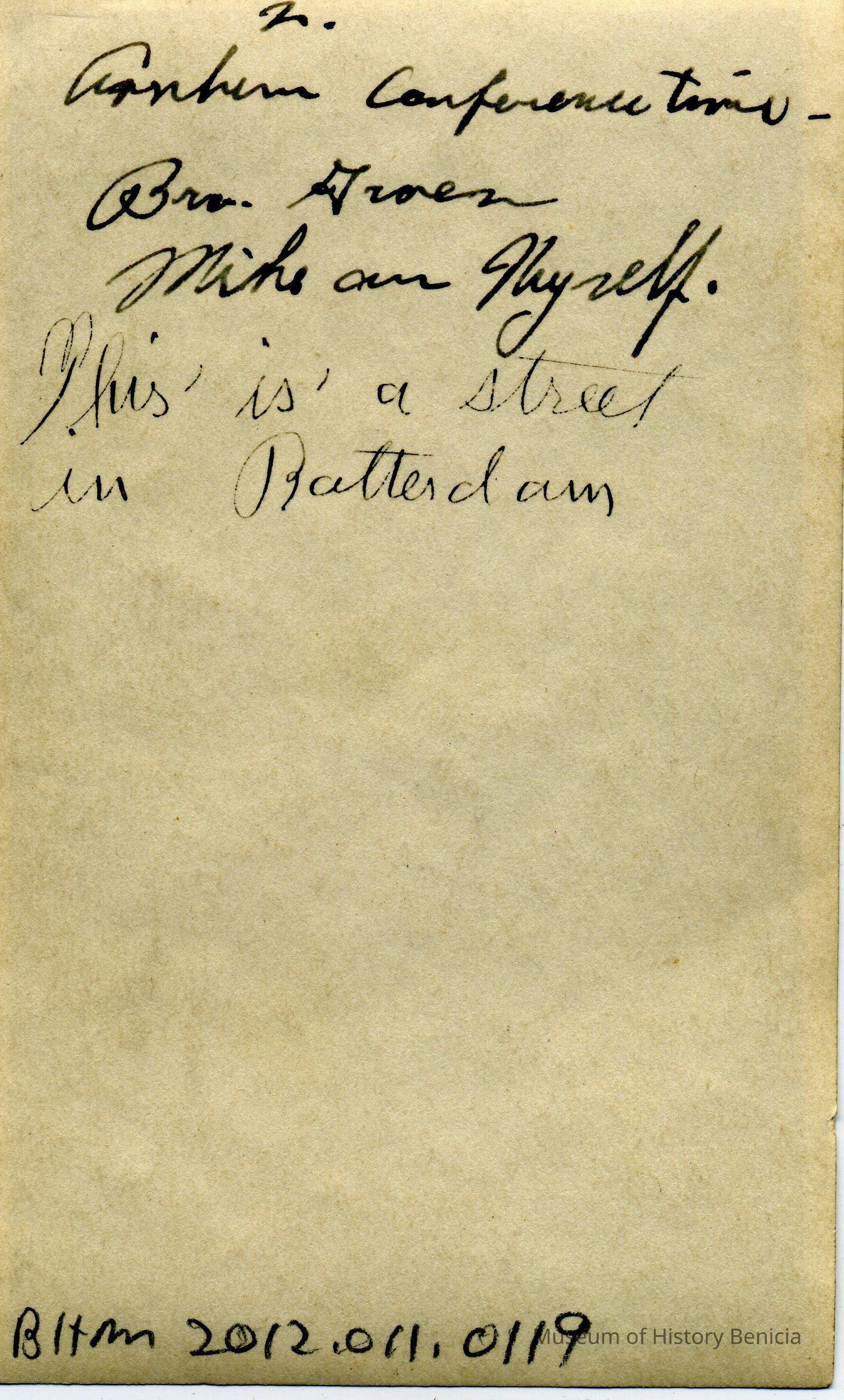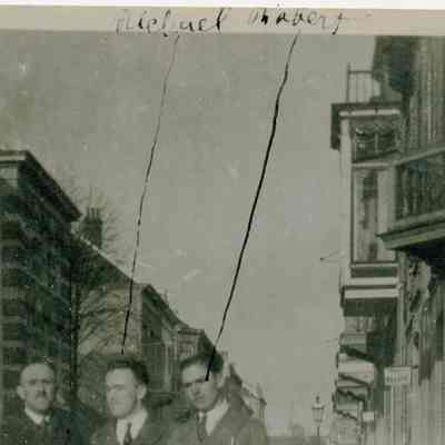 A photo of three guys in coats and suits standing in a street. They are identified on the back as Anheim Conference time - Bro Groen Mike and myself. This is a street in Rotterdam." On the front are lines drawn to the man in the middle (Richuel) and the man on the right (Robert).Collection