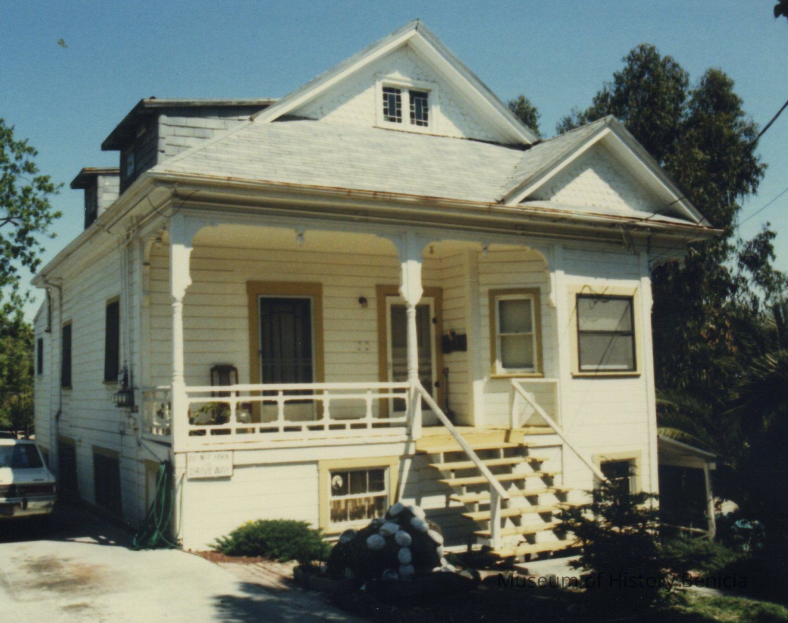 This unit has a truncated hipped roof with front facing gable atop another front facing gable that roofs the bay. Two dormers have been added along with a lean-to at the rear. The unit is drop sided and incudes a front porch.Collection