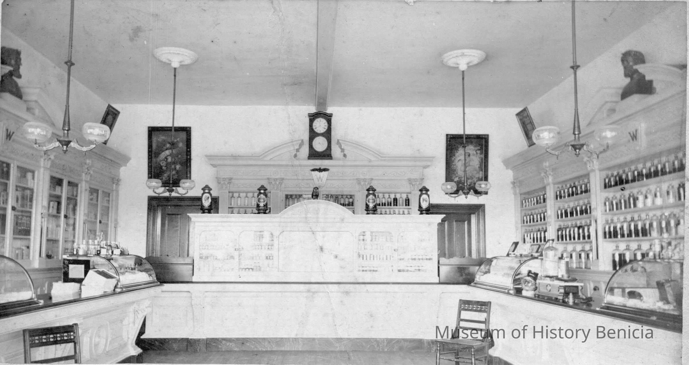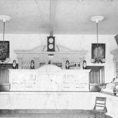 B&W image of a store. Looks like a pharmacy. On the back is a post -it that reads "City Drug Store?" This looks like the store identified by DeBennedetti as Sanborn Pharmacy and later Wolff Drug store.Collection