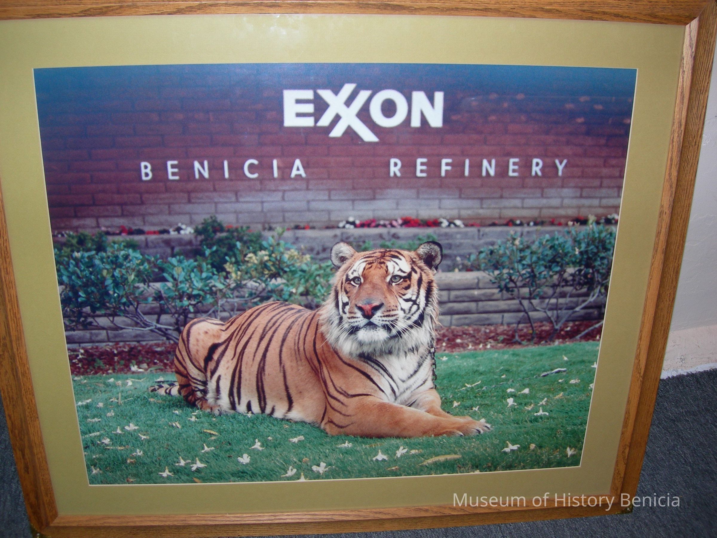 Framed (oak-look) color photograph of a tiger reclining in front of the Exxon refinery's Administration Building (on East Second Street) in the late 1980's or early 1990'sCollection
