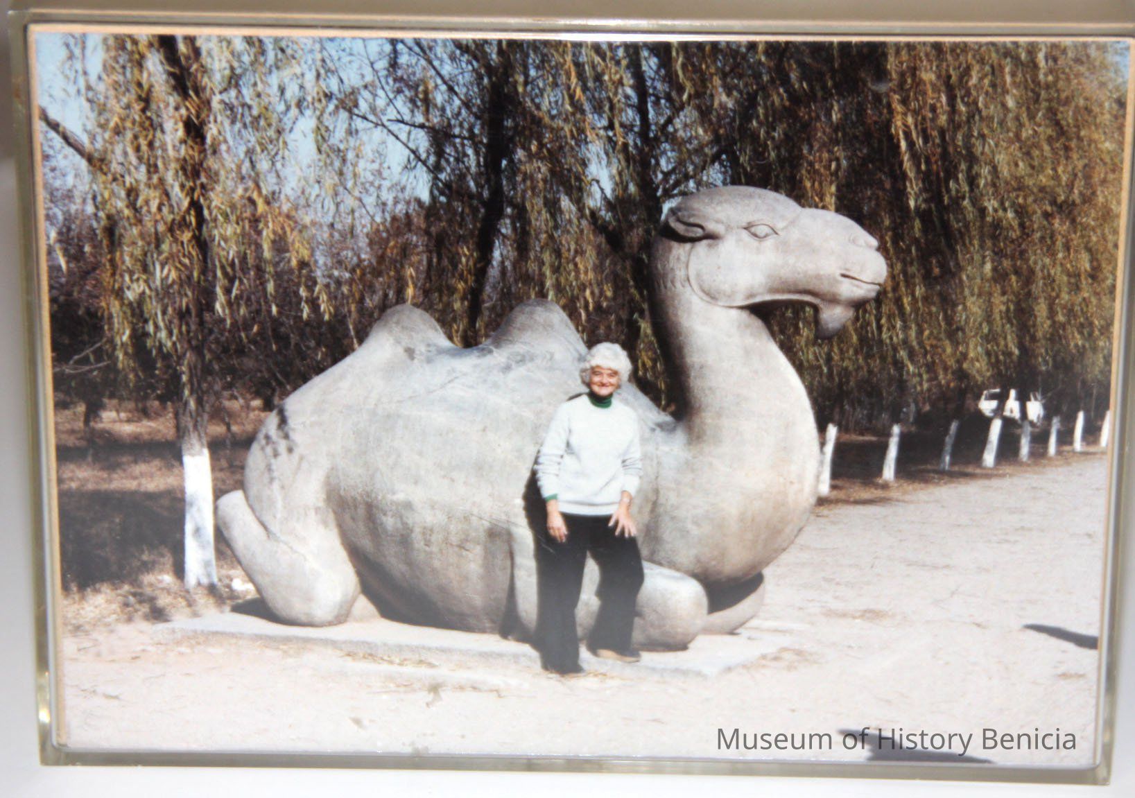Framed photo of Philly Dake and a camel.