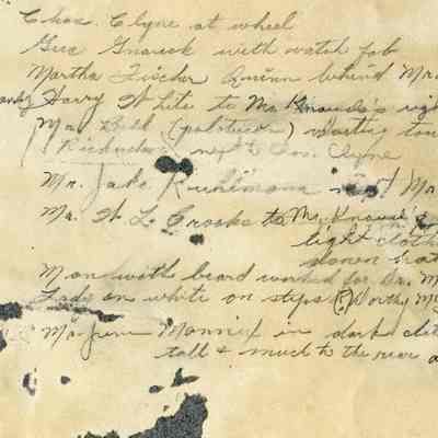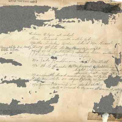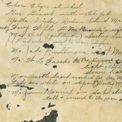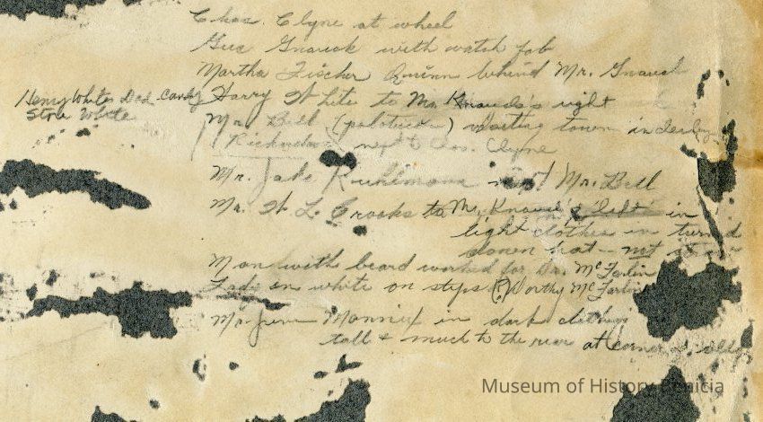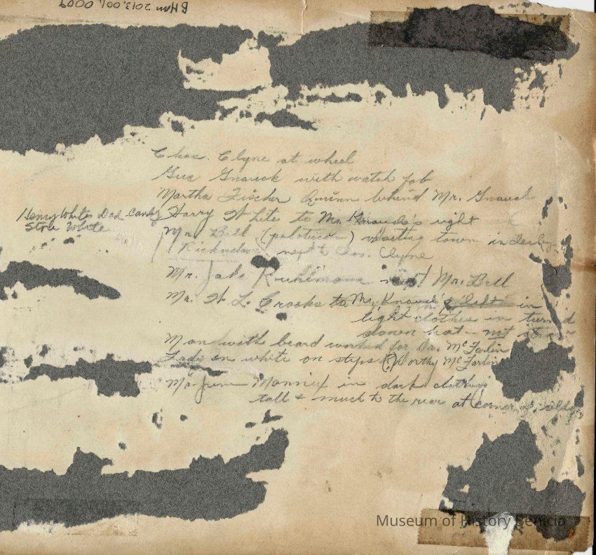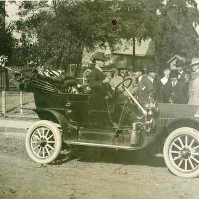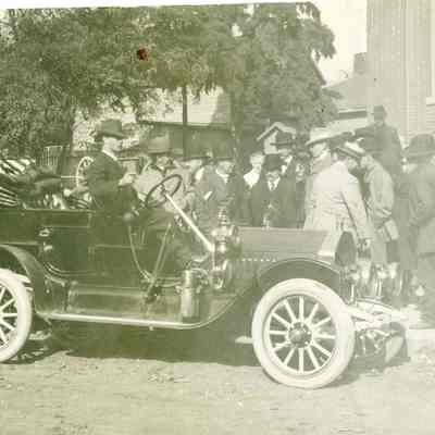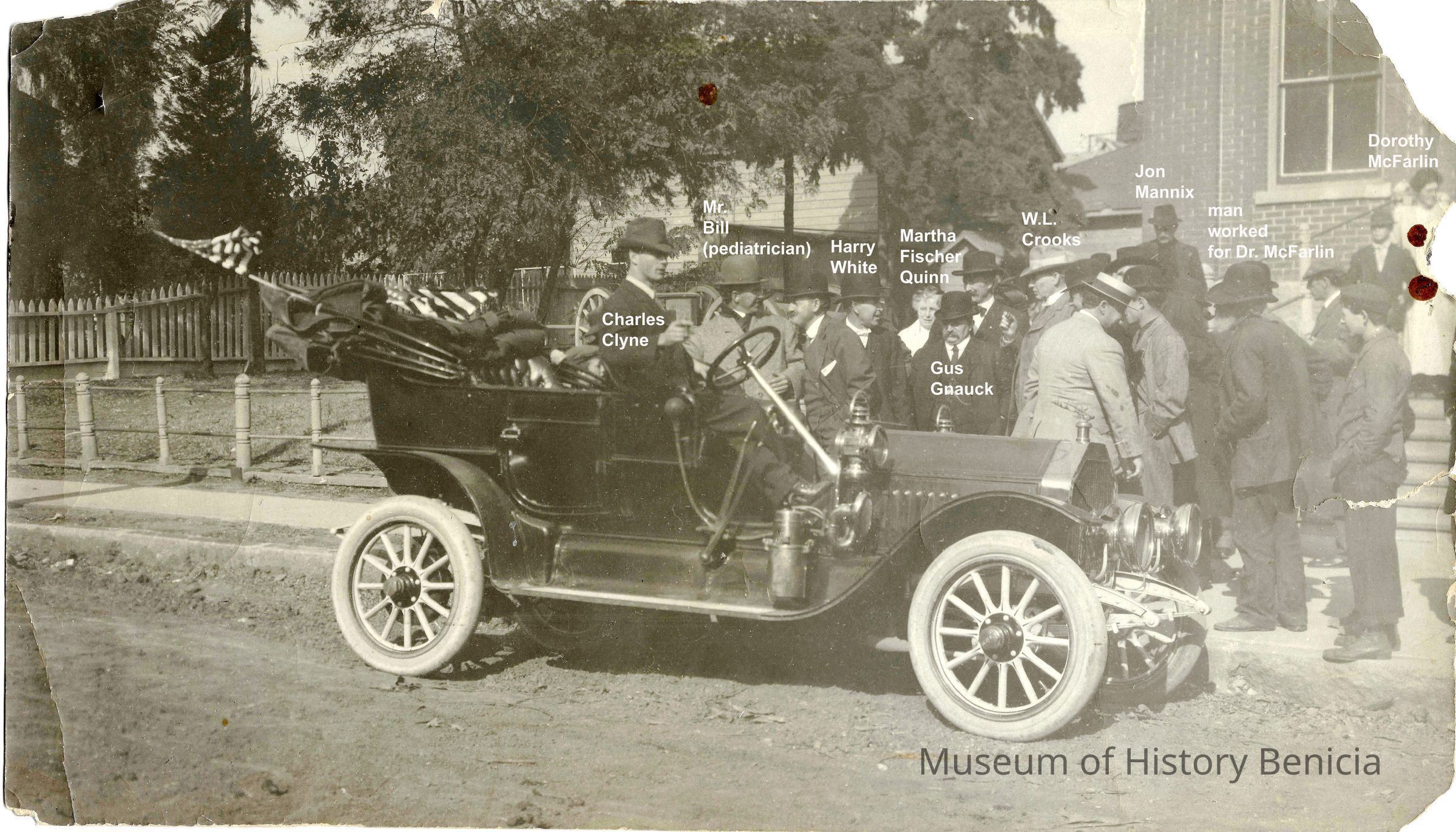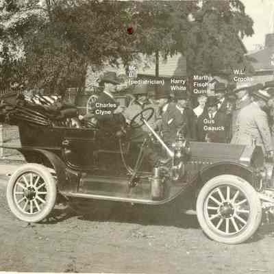 Photo of people around an old car. There is a radiator cap ornament of a deer head with a large pair of deer horns. On the back it identifies the driver as Chas. Clyne. It lists others as Gus Gnauck, Martha Fischer Quinn, Harry White, Richardson, Mr Jads, Mr WL Crooks, man that worked for Dr McFarlin, Dorothy McFarlin, Mr Jim Mannix. See scan for more complete description of each person.