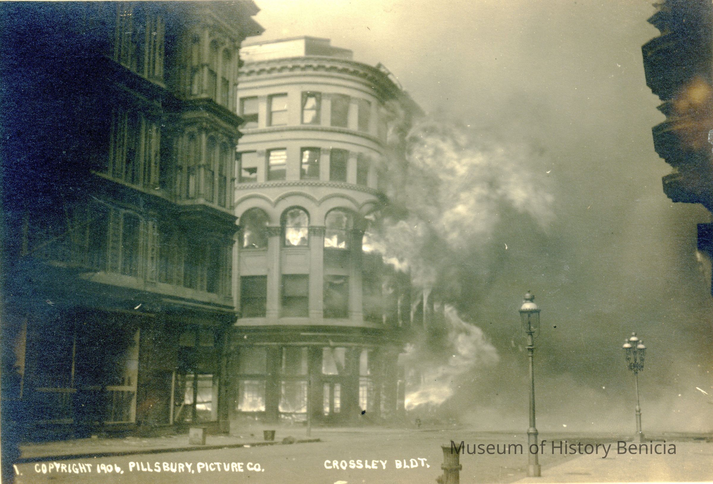 Pillsbury Pictures photo of SF Earthquake. This photo is of the Crossley Bldg on fire after the SF earthquake of 1906.