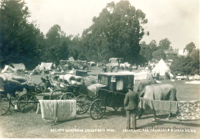 This photo is of the Golden Gate Refugee Camp after the SF earthquake of 1906. The printed title says "Society Camped in Golden Gate Park".Collection