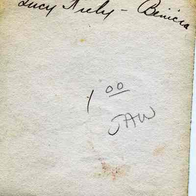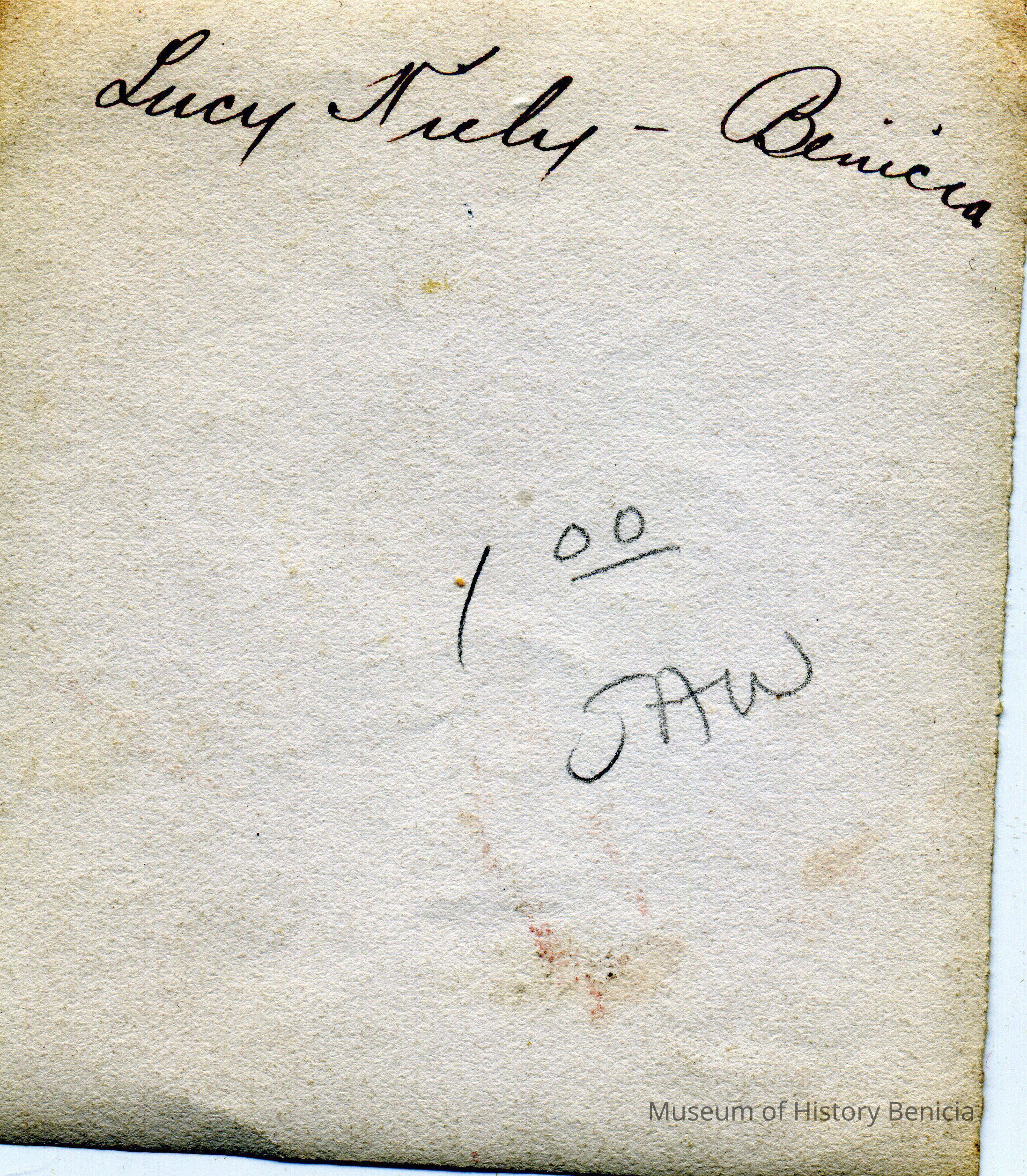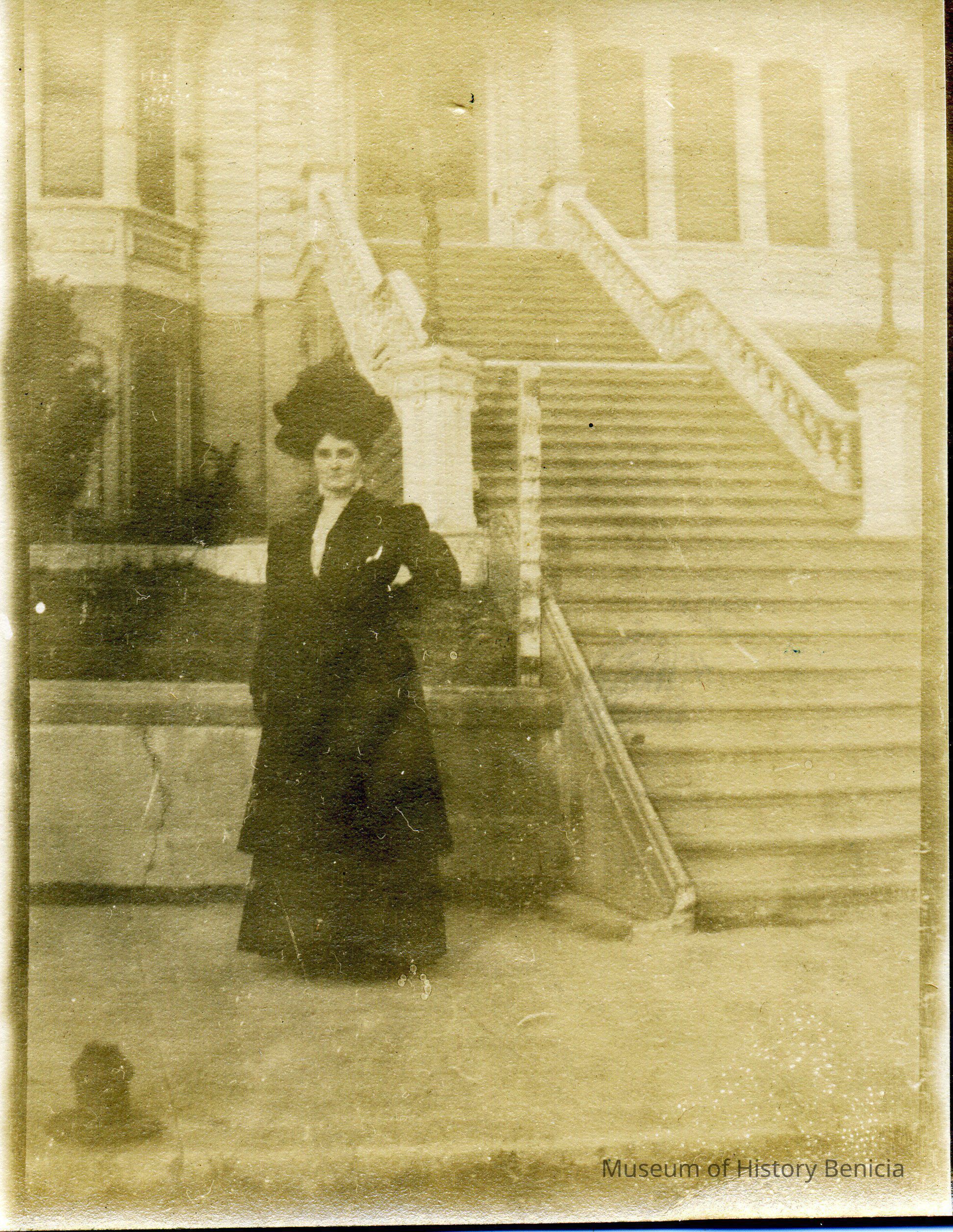 Photo of a woman in front of Hastings house on West 2nd . On the back it says "Lucy Hicks" "Benicia".