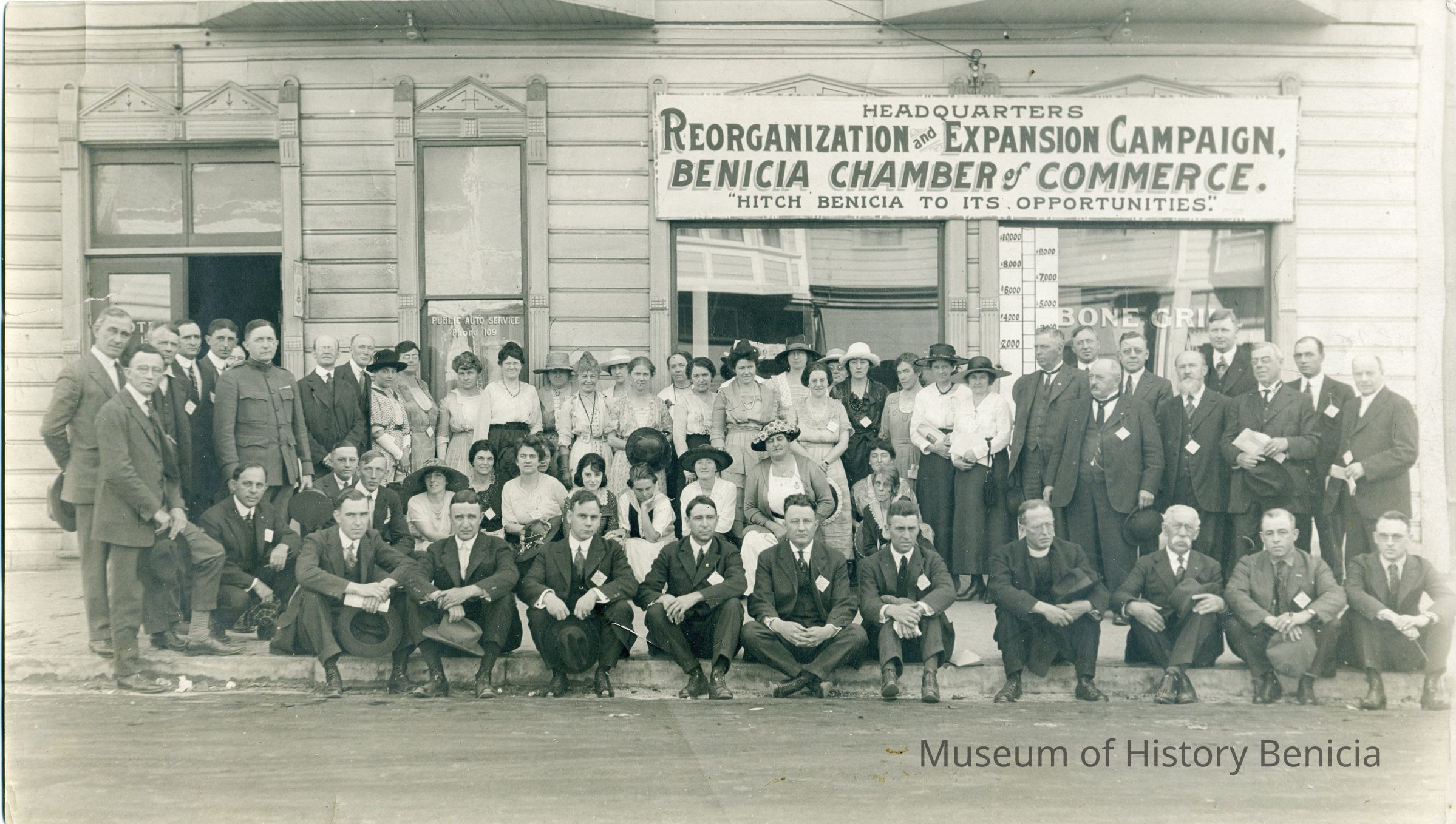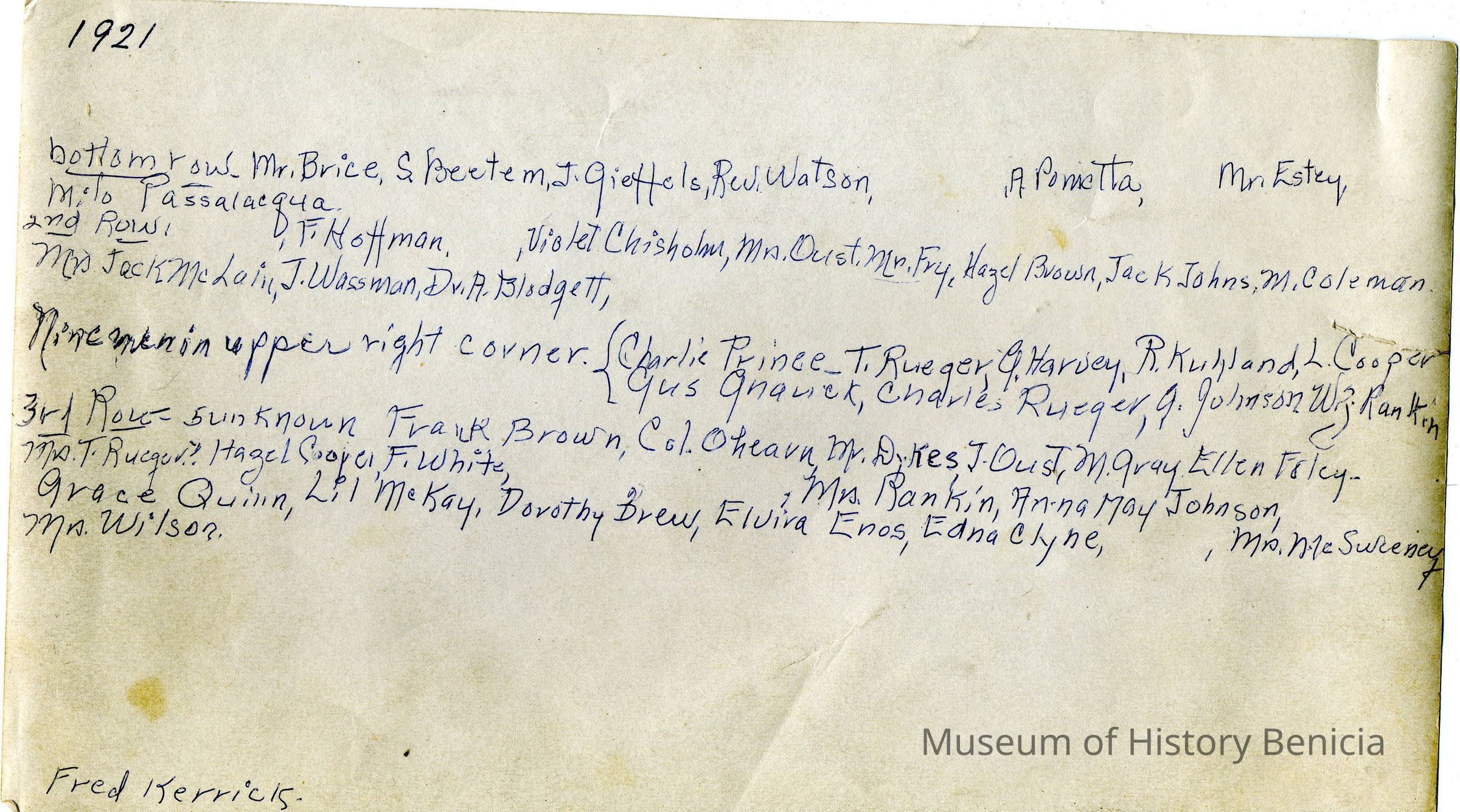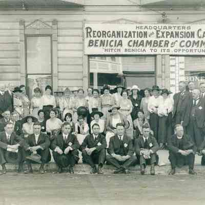 Photo of Benicia Chamber of Commerce. The back lists names of many who are in the photo. At the bottom on the back it says Fred Kerrick. This may be who owned the photo in the first place.