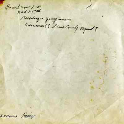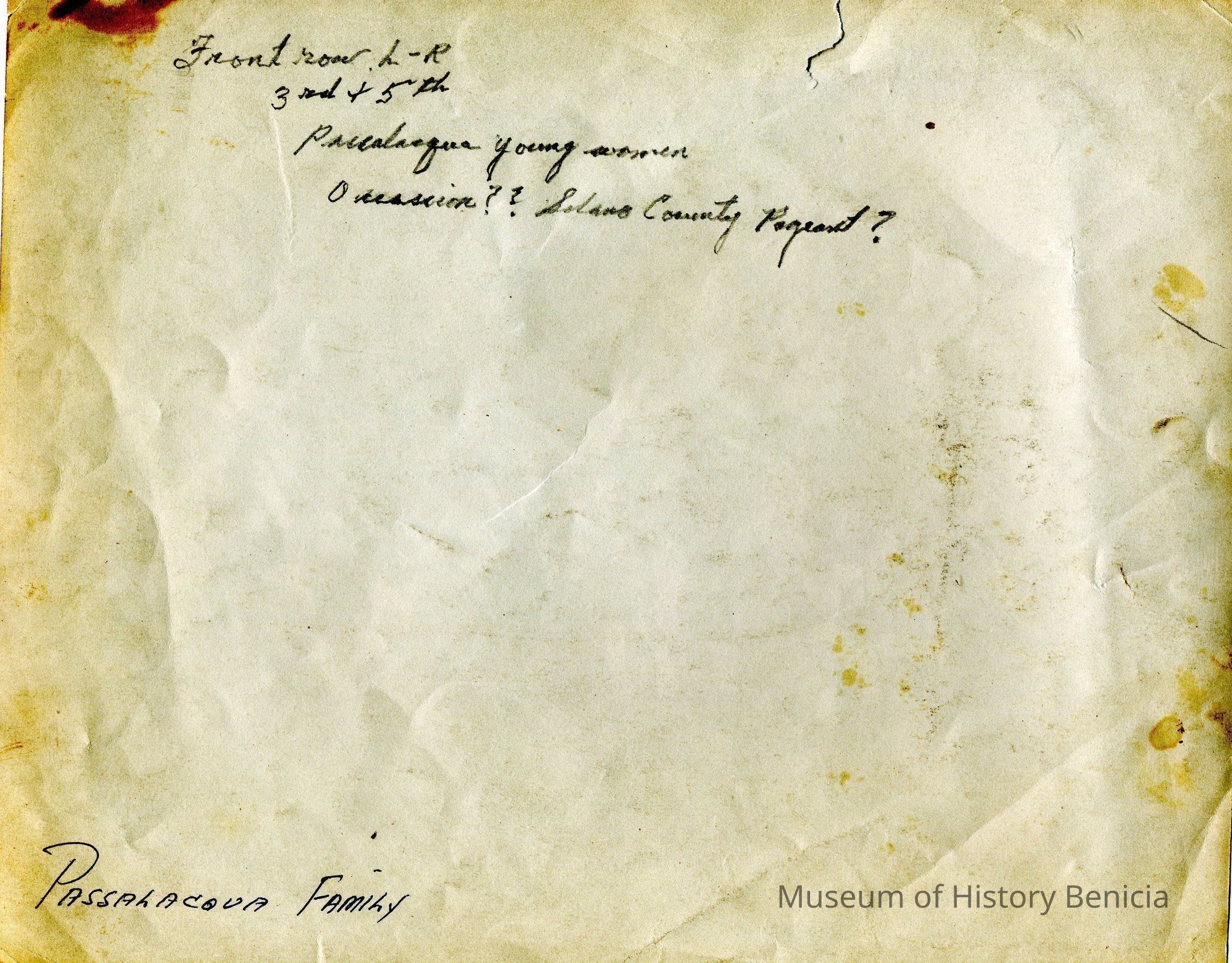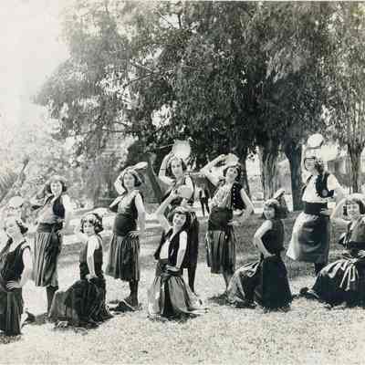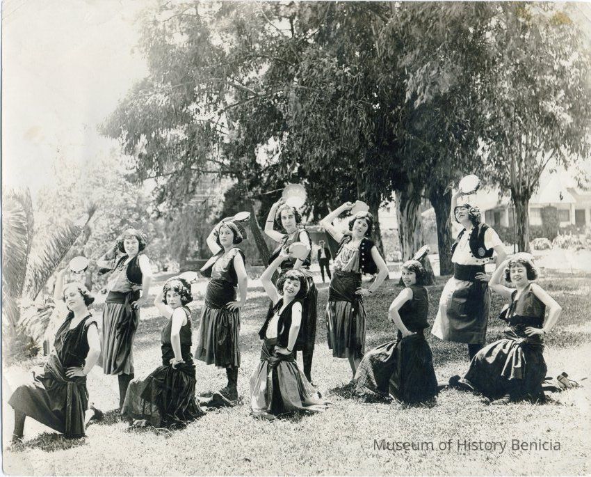 Photo of a group of girls dressed in a Spanish costume with tamborines. The back says this is the "Solano County Pagent?" and that one of the girls is Passalacqua.Collection