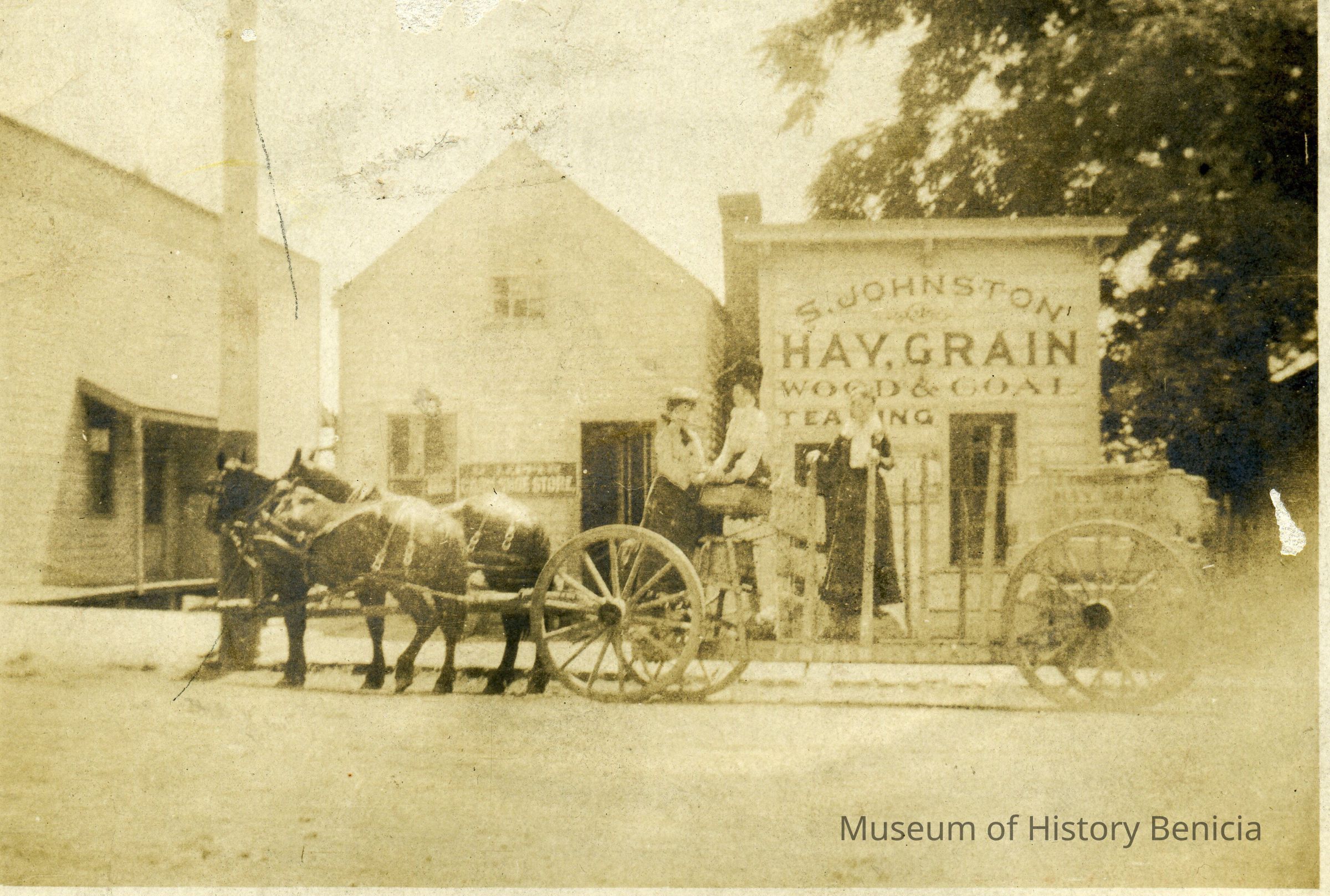 Photo of horses and a wagon in front of S. Johnston Hay, Grain in Benicia. There are two women in the wagon and one standing on the wooden sidewalk.Collection