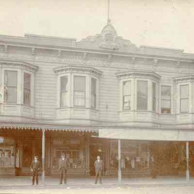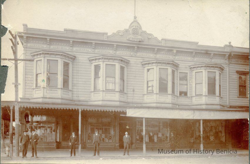 Photo of the Power building in Benicia with several men standing on the sidewalk.