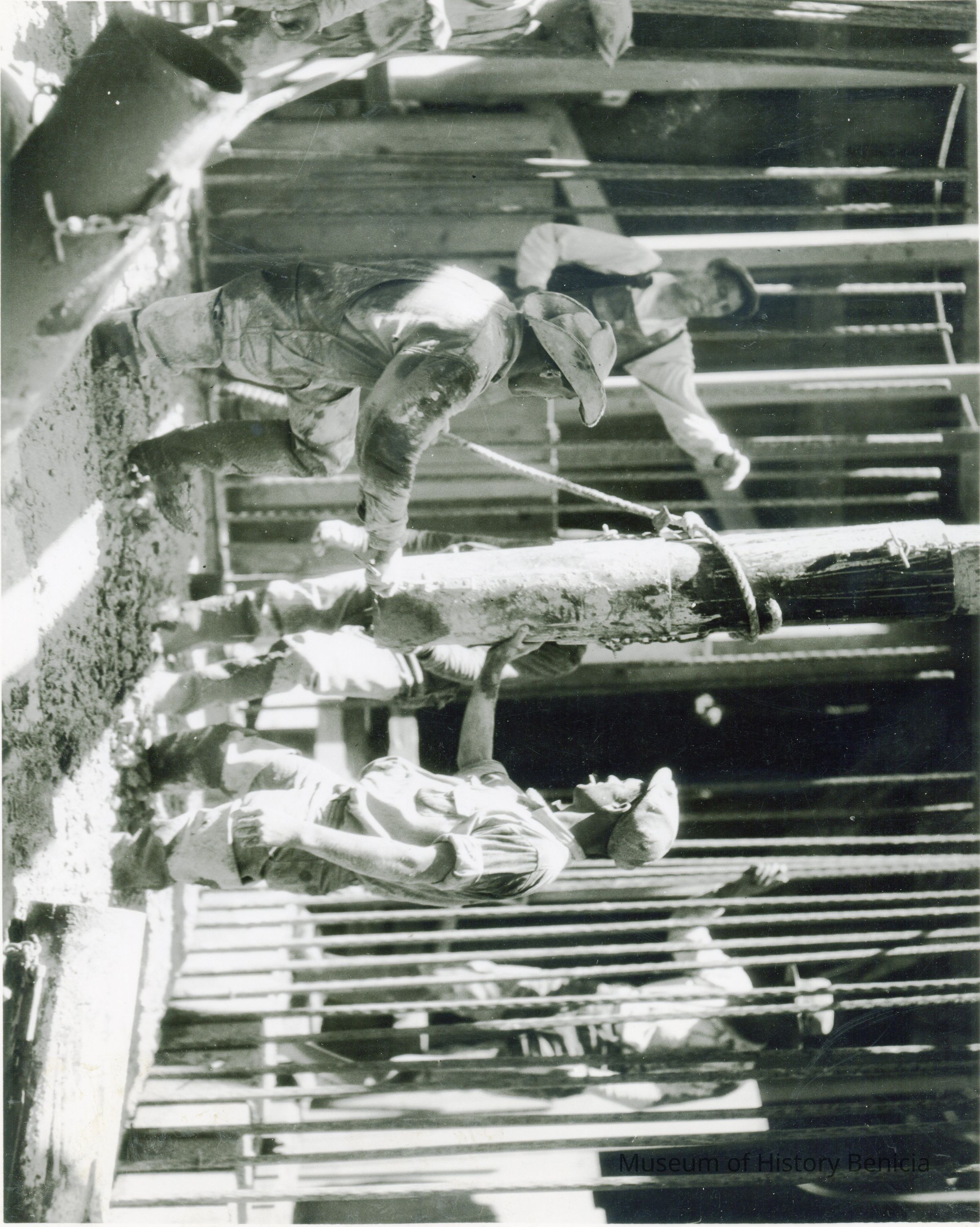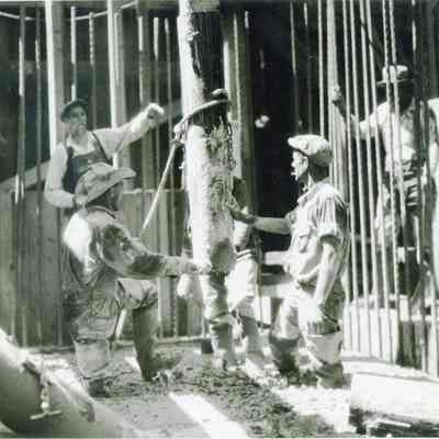 Photo of men setting a post in concrete. The back says the photo was donated by "S.P." in San Francisco.