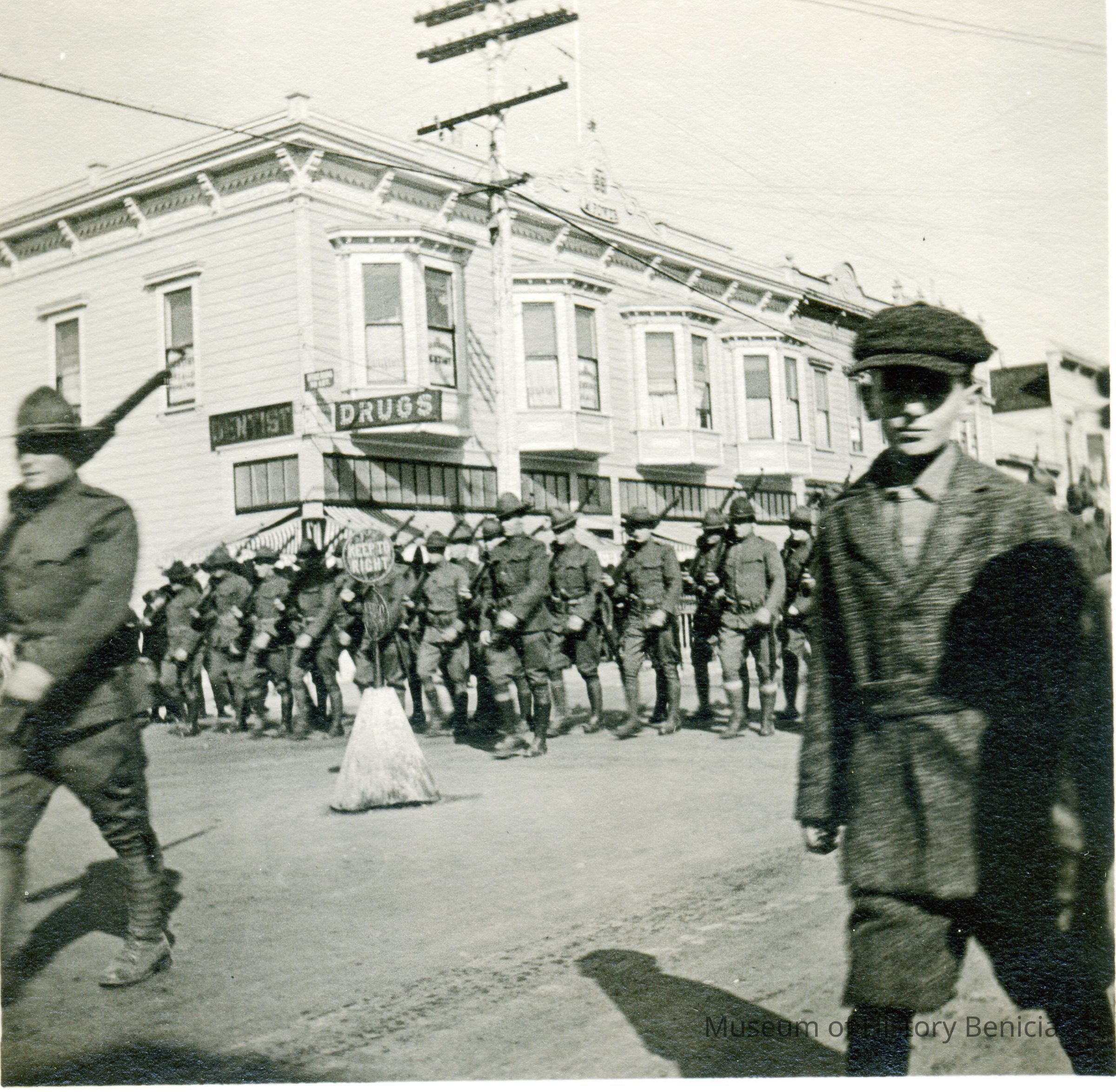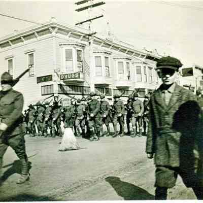 Photo of soldiers marching on First Street. Looks like WW I soldiers. The back has the year 1918 written on it.