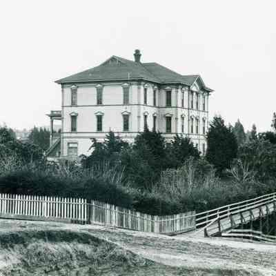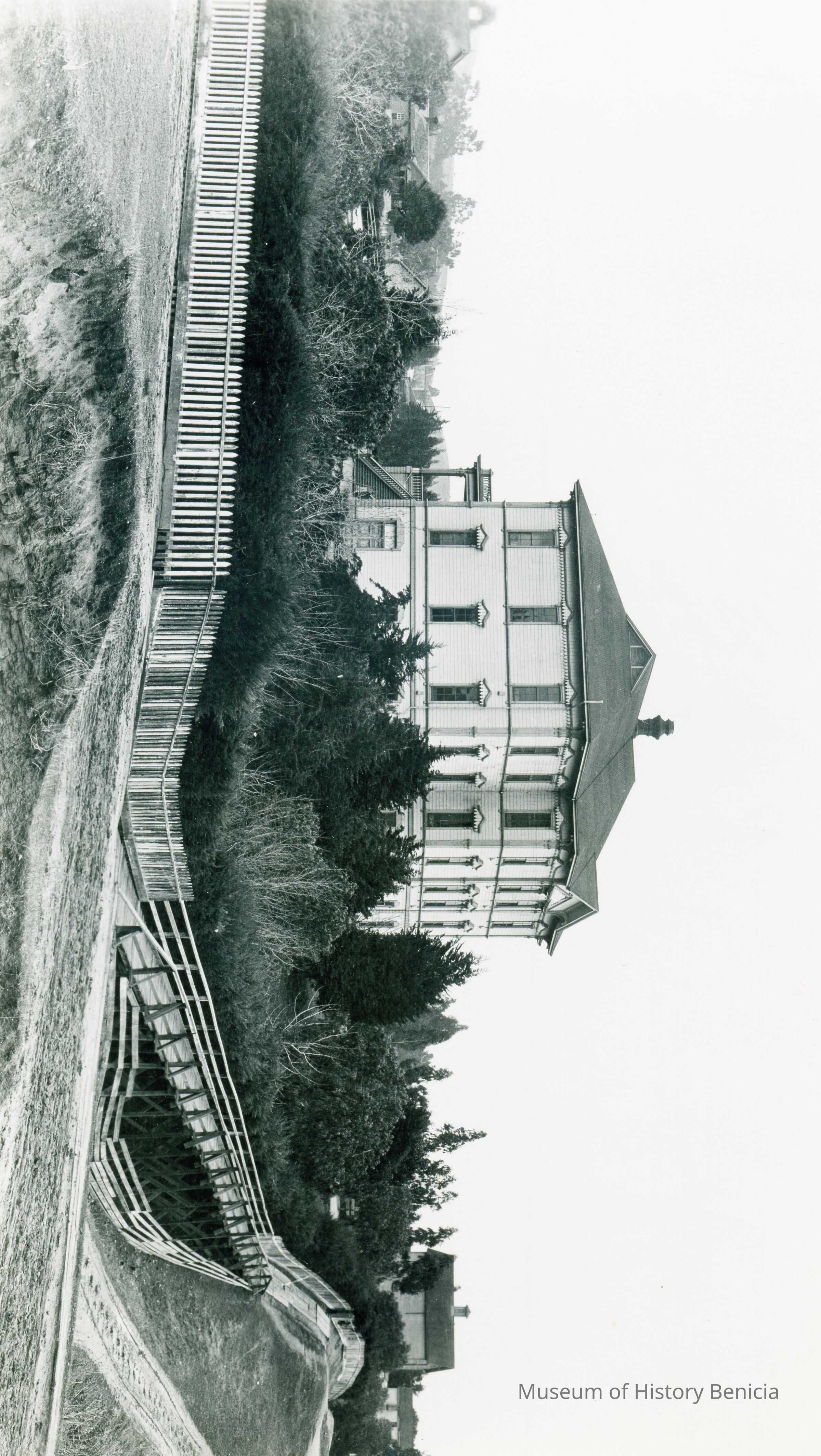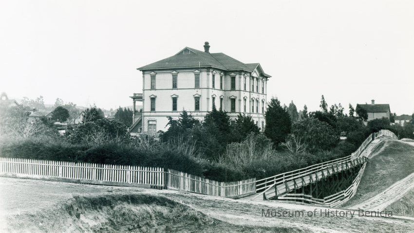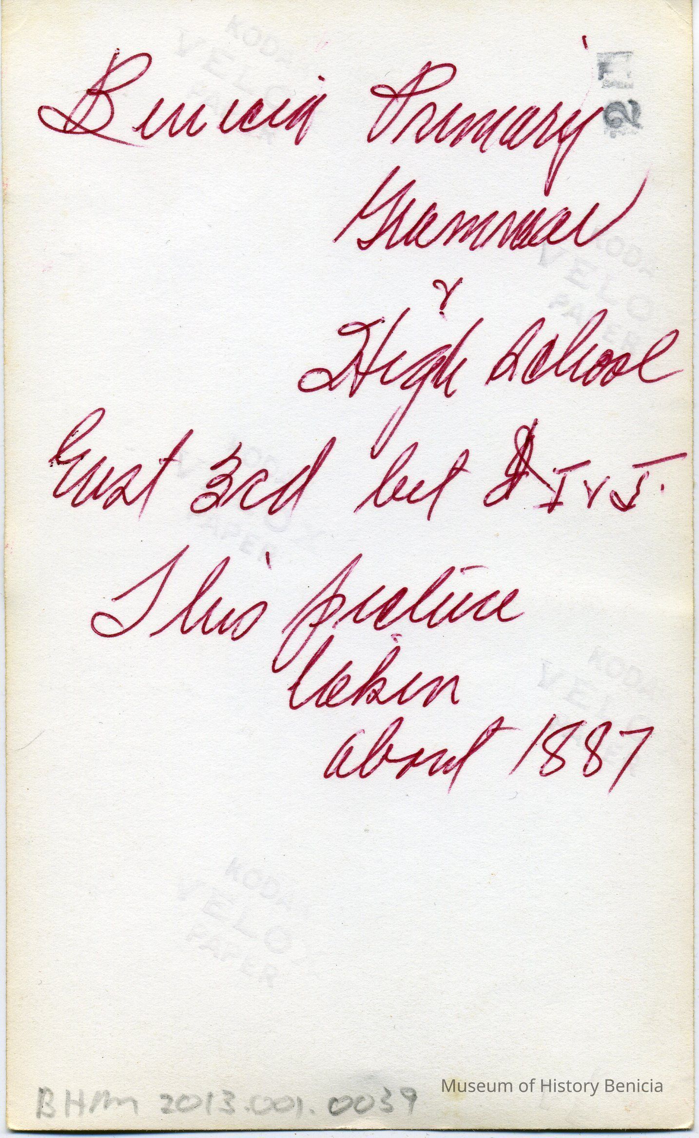 Photo of Benicia Grammar School. The back says "Benicia Grammar & High School East 3rd bet I & J This picture taken aboiut 1887".Collection