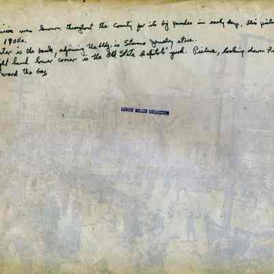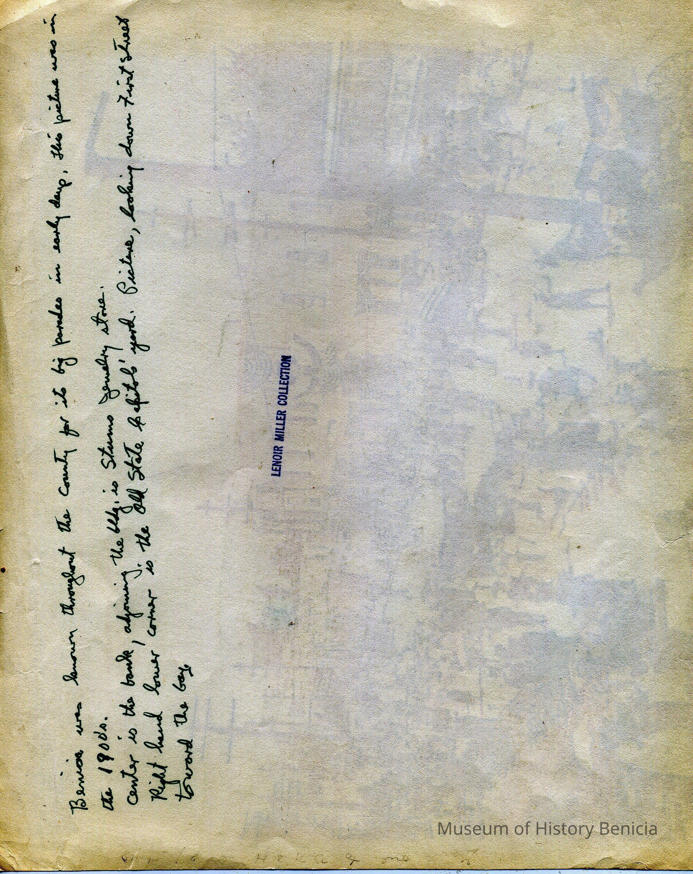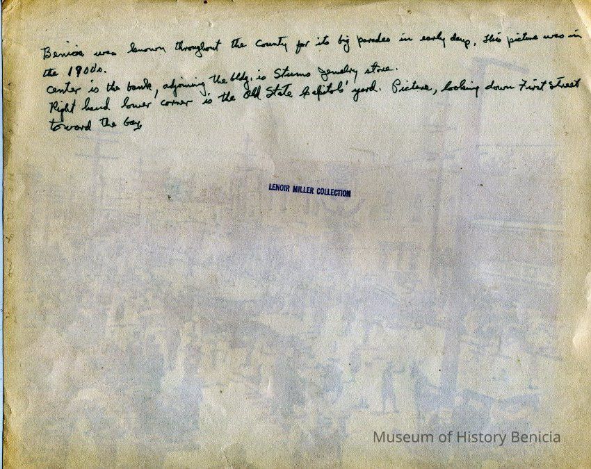"Benicia was known throughout the county for its big parades in early days. This picture was in the 1900's. Center is the bank, adjoining the bldg is Stums (sic) Jewelry store. Right hand lower corner is the Old State Capitol's yard. Picture looking down First Street toward bay."