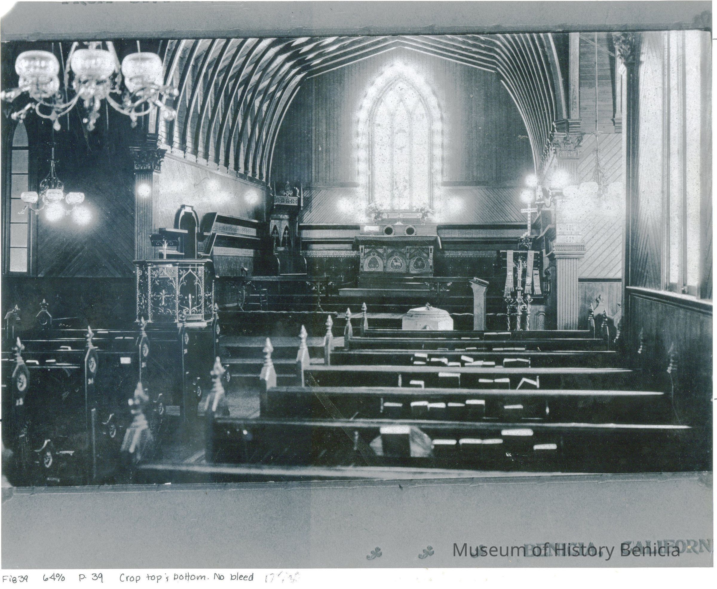 Photo of St Paul's Episcoal Church interior in Benicia. There are printing notes at the bottom. One says Fig 39 and another 64% and P39 and "crop top & bottom. no bleed". This photo was probably used in the Charline Dillingham Erwin historical essay on St Paul's for the 125th anniversary in 1970.Collection