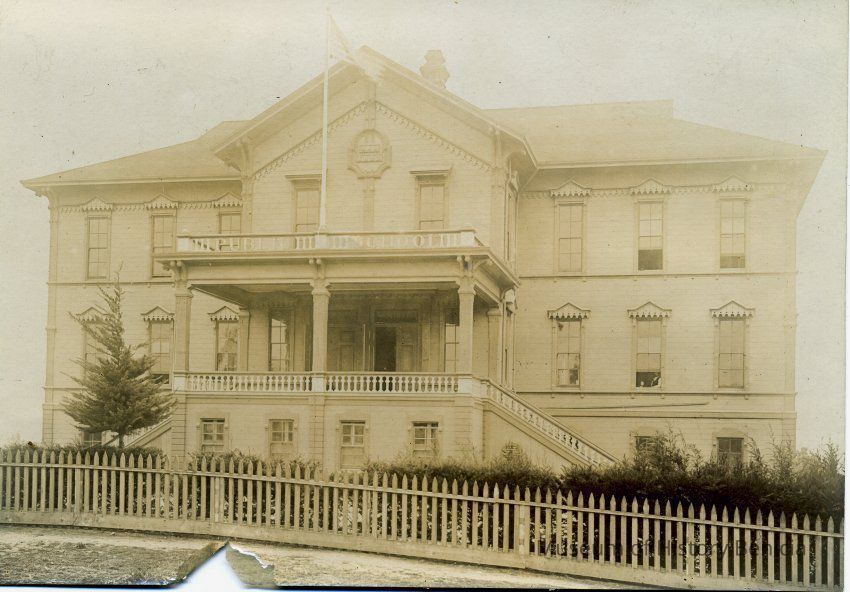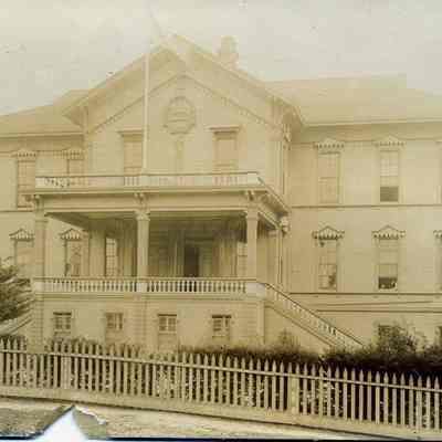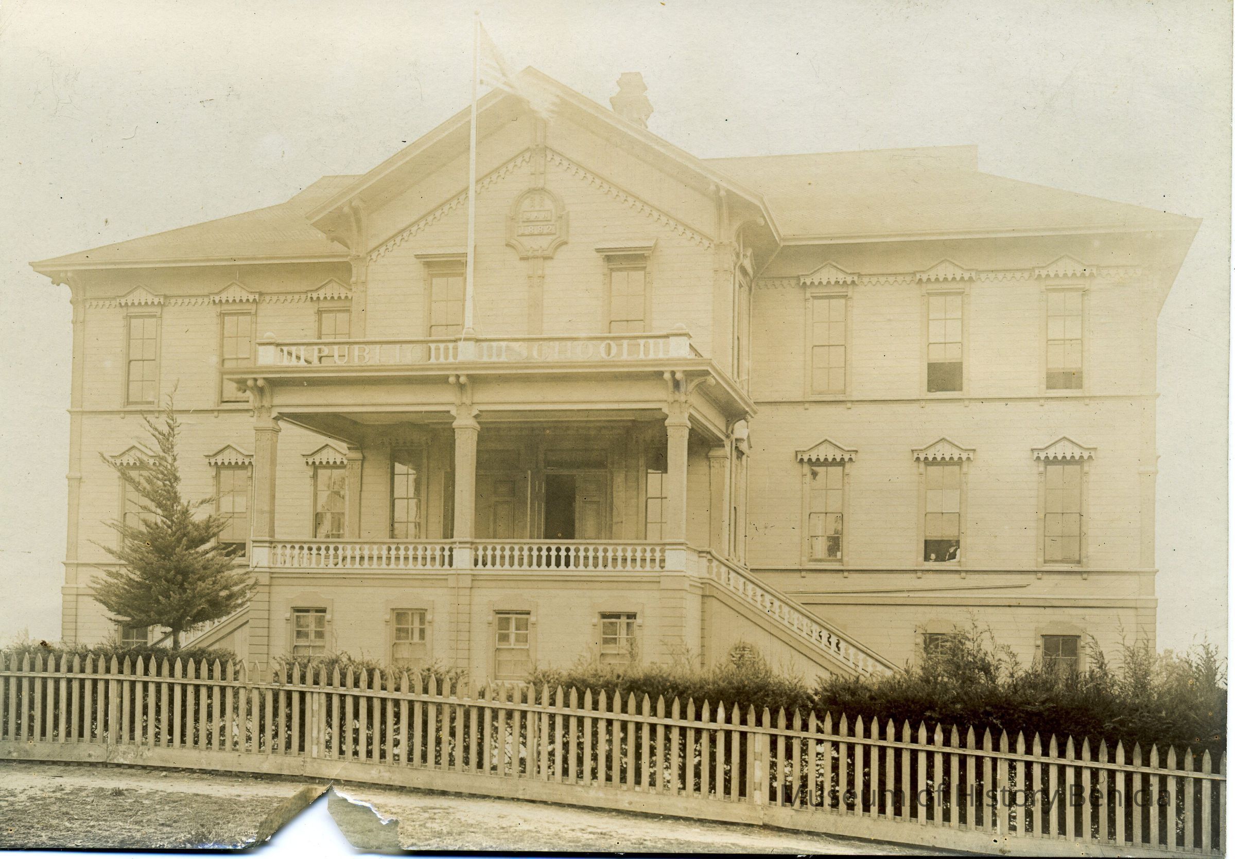 Photo of the Benicia Grammar School. The stairs are going off to either side rather than down the front of the building. There are two people in the window on the right. Looks like a man and a small child or maybe a woman squating down.Collection