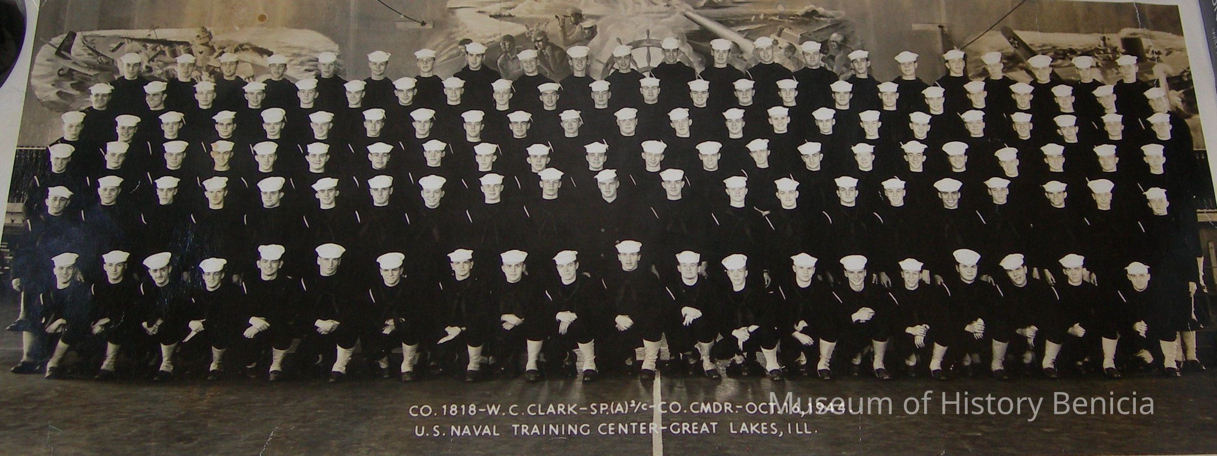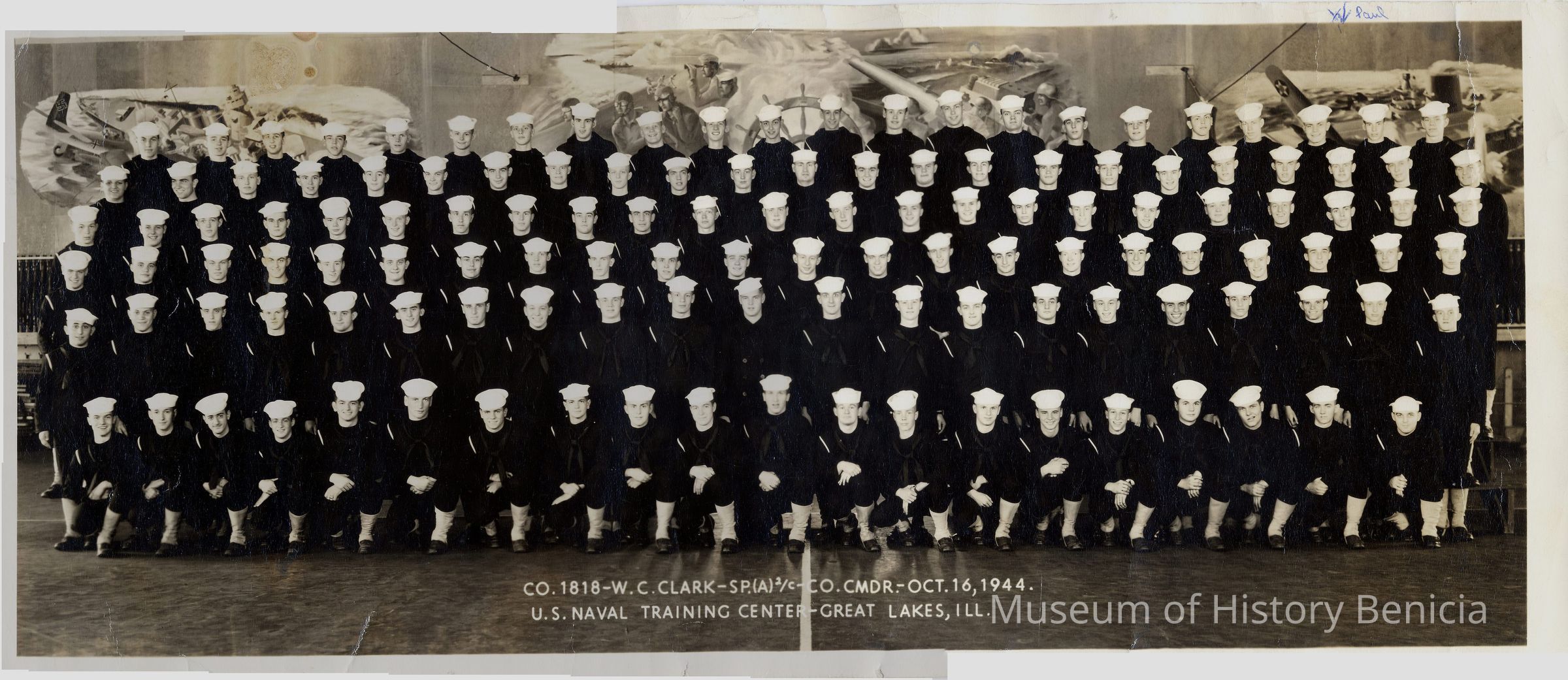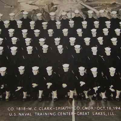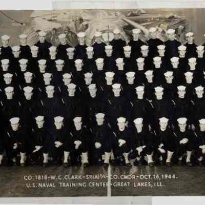 B/W photograph of Naval Training Recruit Training Center Graduation "CO. 1818-W.C. Clark - SP.(A) 2/C-CO. CMDR - October 16, 1944 U.S. Naval Training Center - Great Lakes, Ill."