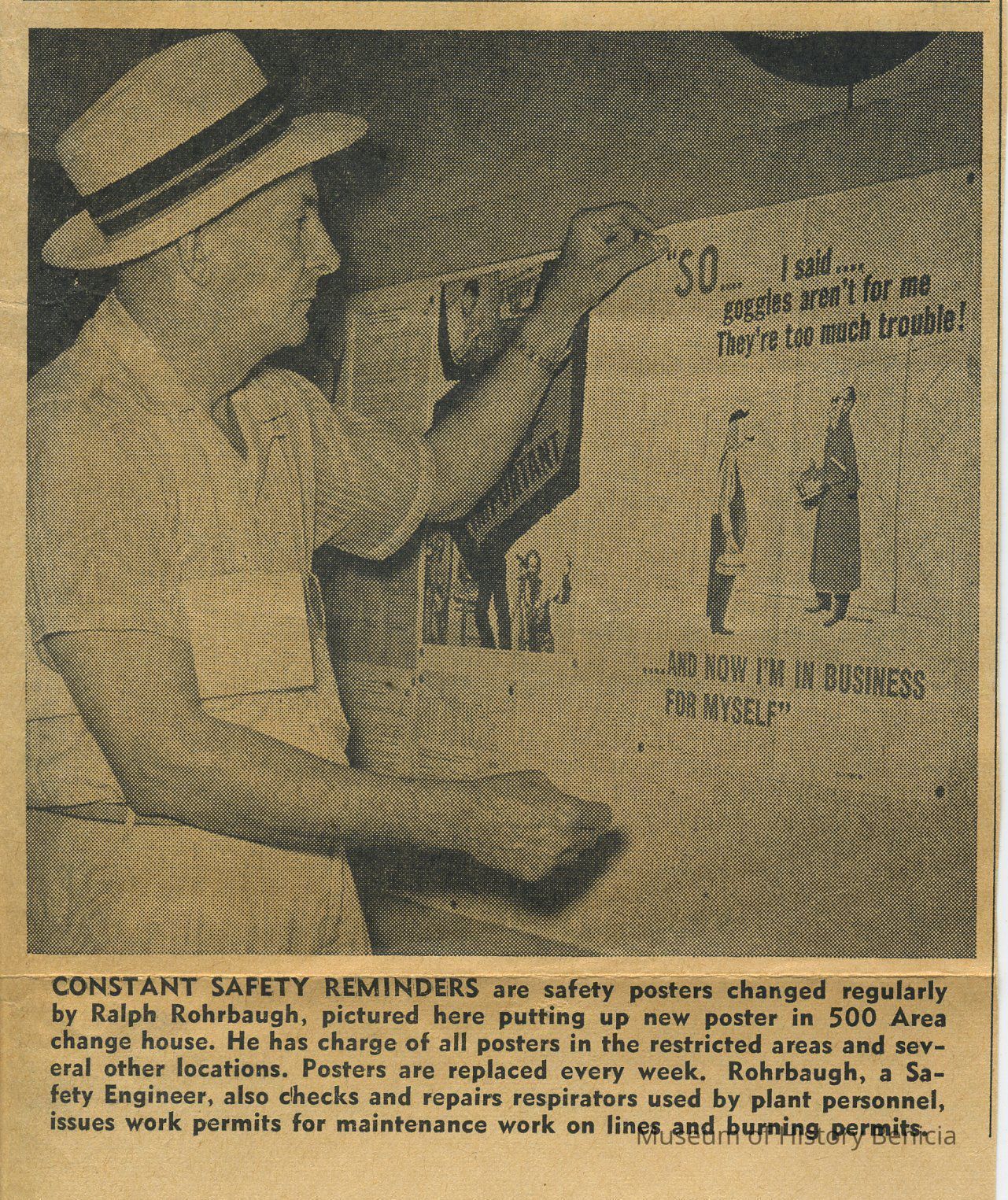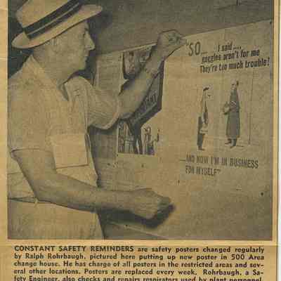 .0027b - b/w newspaper clipping; caption: "Constant Safety Reminders are safety posters changed regularly by Ralph Rohrbaugh, pictured here putting up new poster in 500 Area change house. He has charge of all posters in the restricted area and several other locations. Posters are replaced every week. Rohrbaugh, A Safety Engineer, also checks and repairs respirators used by plant personnel, issues work permits for maintenance work on lines and burning permits." 4-1/4" x 5-1/2"