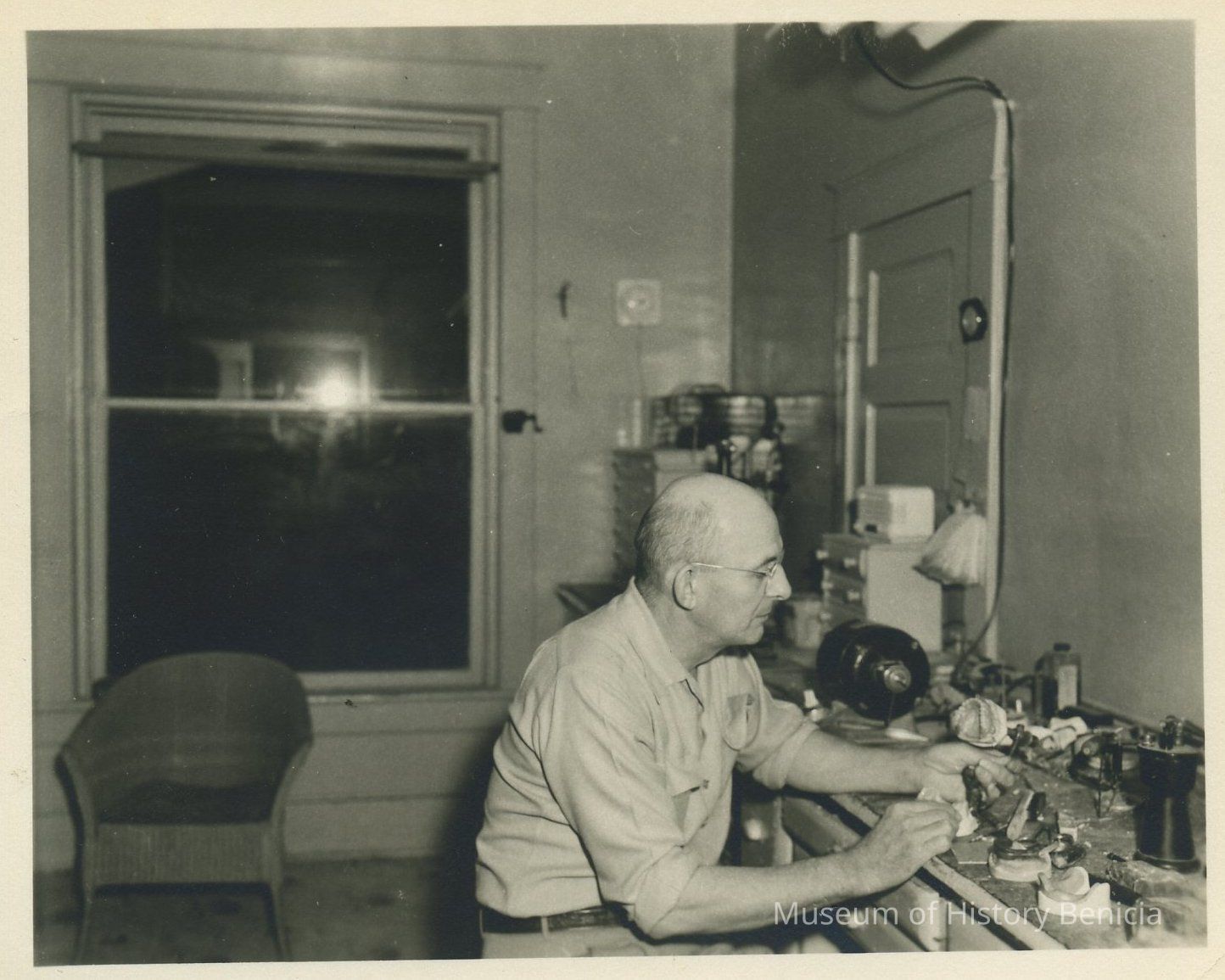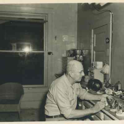 .0027c - b/w photograph of Ralph Rohrbaugh at a work bench in an unknown location; he could be working on molds of teeth impressions. 5-1/2" x 4-1/4"