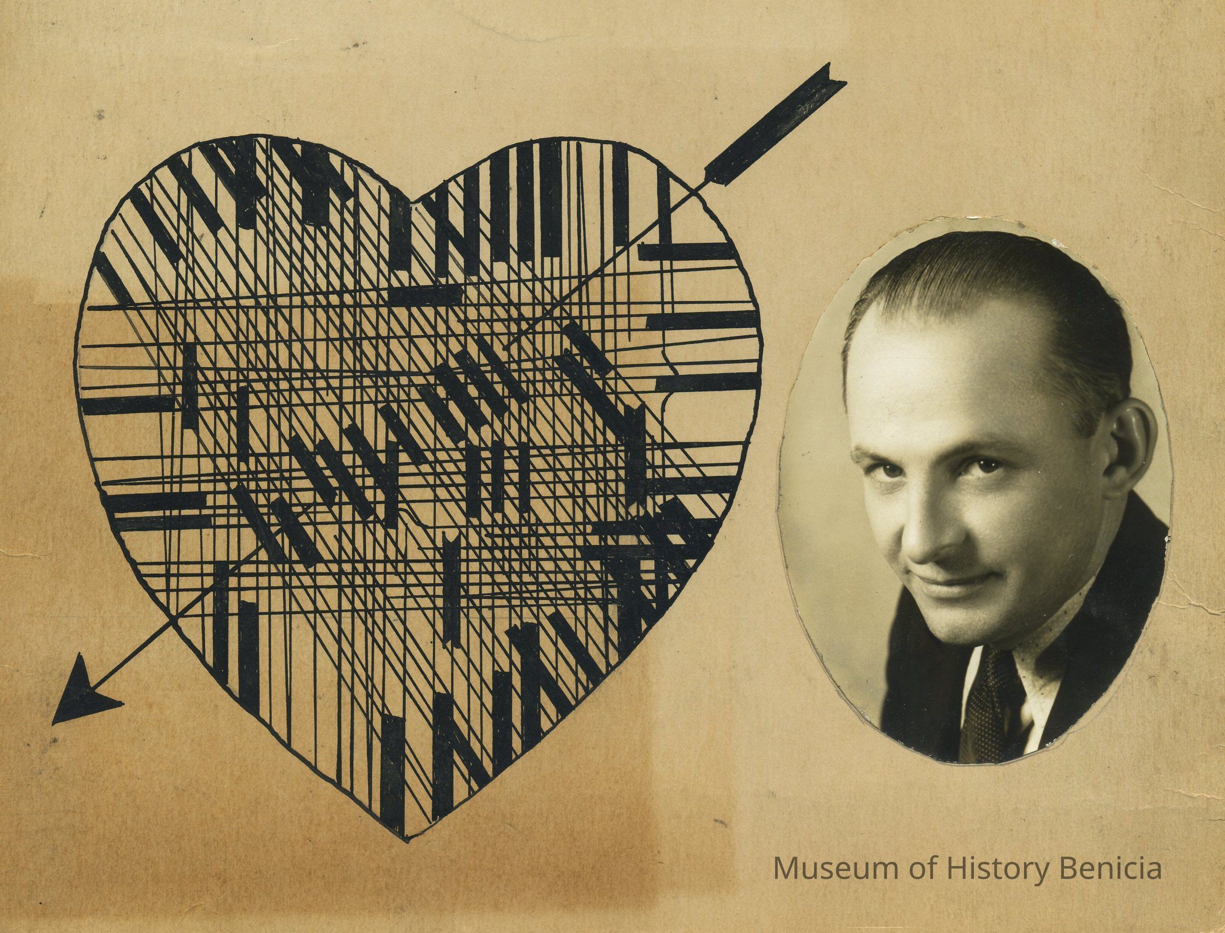 .0027d - b/w oval photograph of Ralph Rohrbaugh glued in the lower right corner of an 8" x 10" cardboard backing; lower left has a drawing in black ink of a heart with lines and an arrow pointing from upper right to lower left. photo 3-1/2" x 2-1/2"Collection