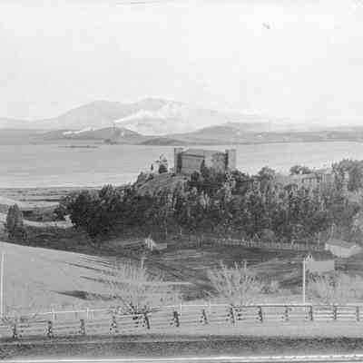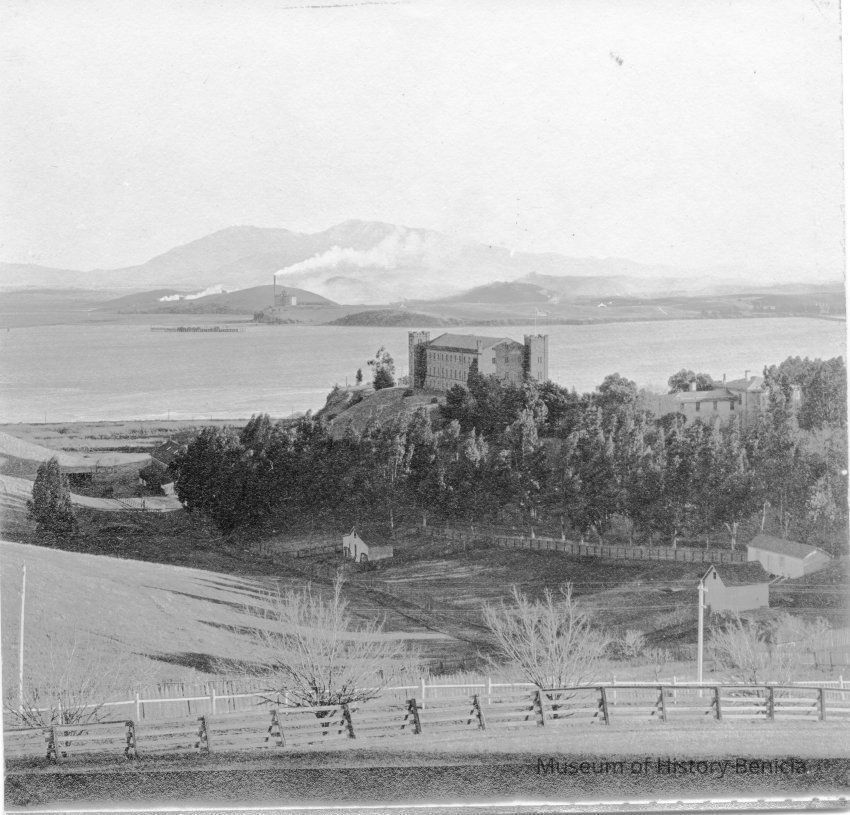 Photo of the Benicia Clock Tower and the Carquinez Straits. Clock Tower is prior to the fire that reduced it to two stories.