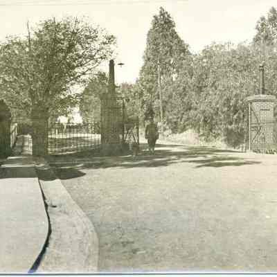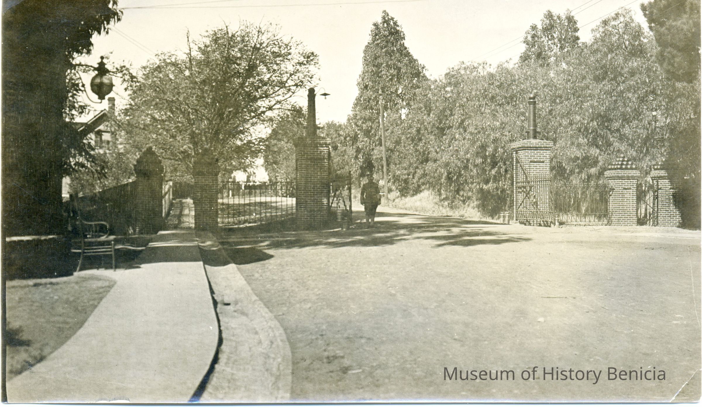 Photo of the Benicia Arsenal gates. This is similar to a view taken by Frank Stumm for one of his postcards.