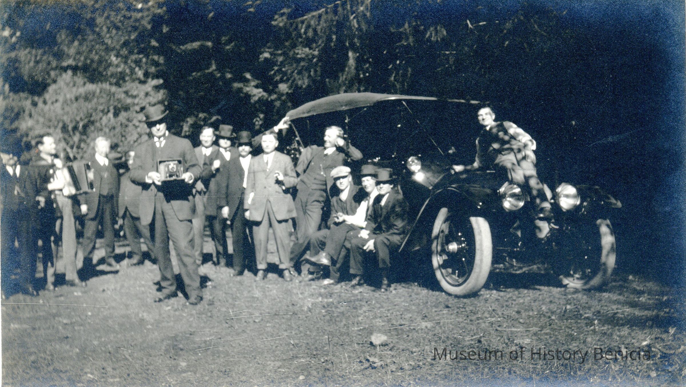 Photo of a group of men outside partying. The photos came in an envelope that says "Stag Party at Tucker's". The only reference to Tuckers I could find was to a resort near Mt Tamalpias in the early 1900s. It could be that this group of Benician's made a road trip to Mt Tamalpias as a getaway. The museum has the original negatives from this trip. They are assumed to be by John Molfino.