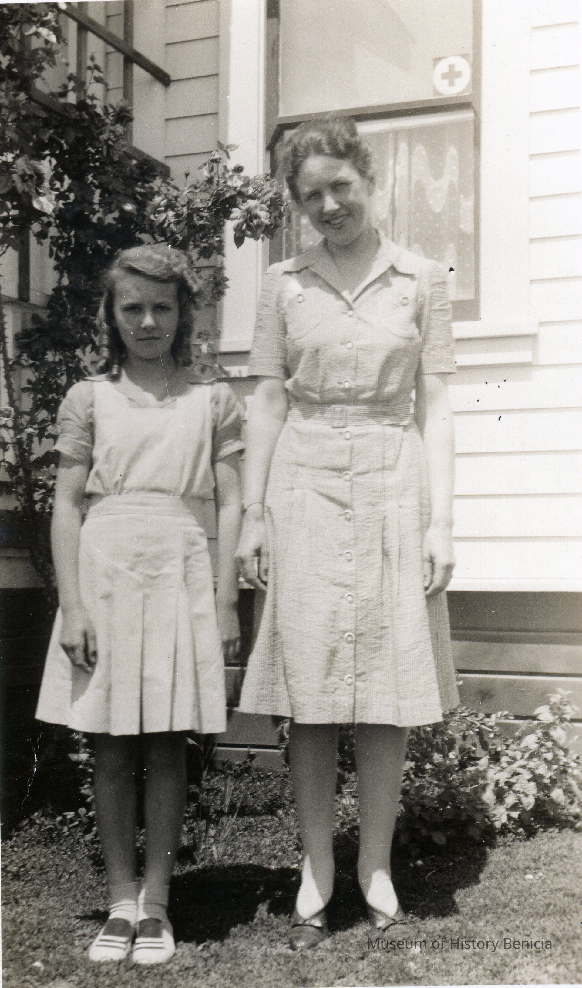 Photo of a woman and a young girl in front of their house. Part of the address reads ?74.