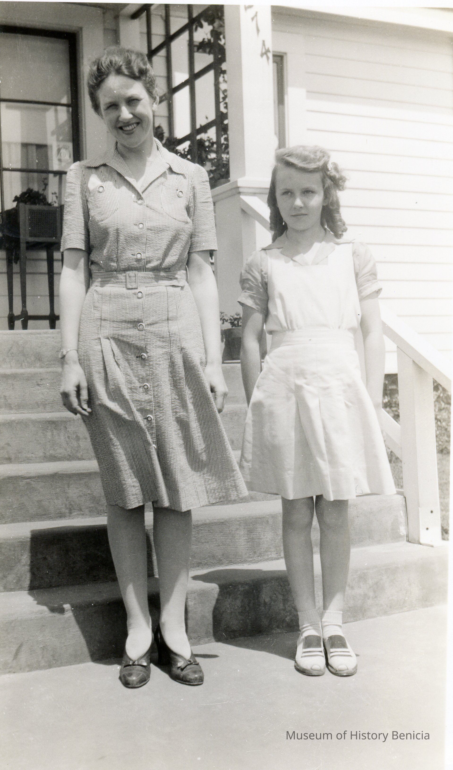 Photo of a woman and a young girl in front of their house. Part of the address reads ?74.