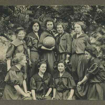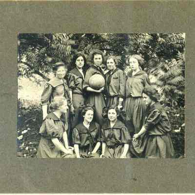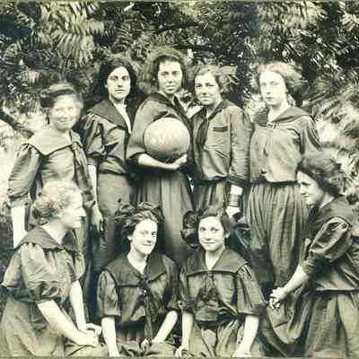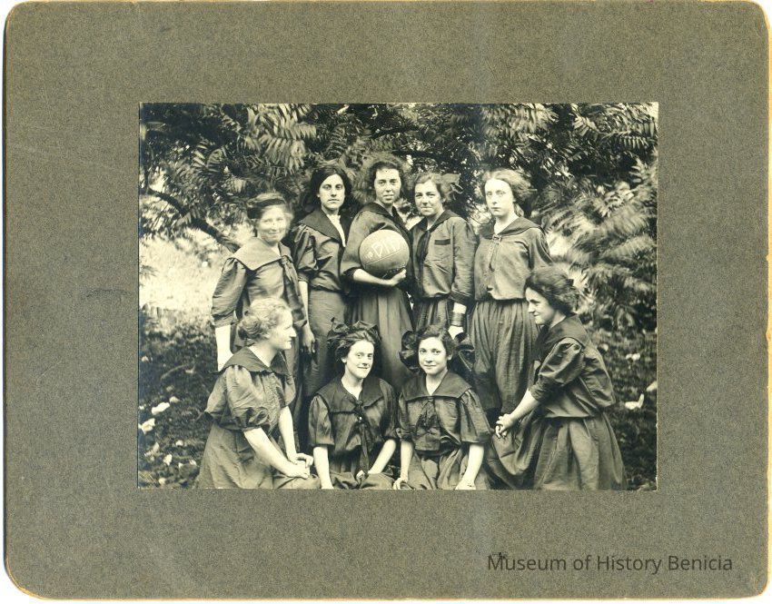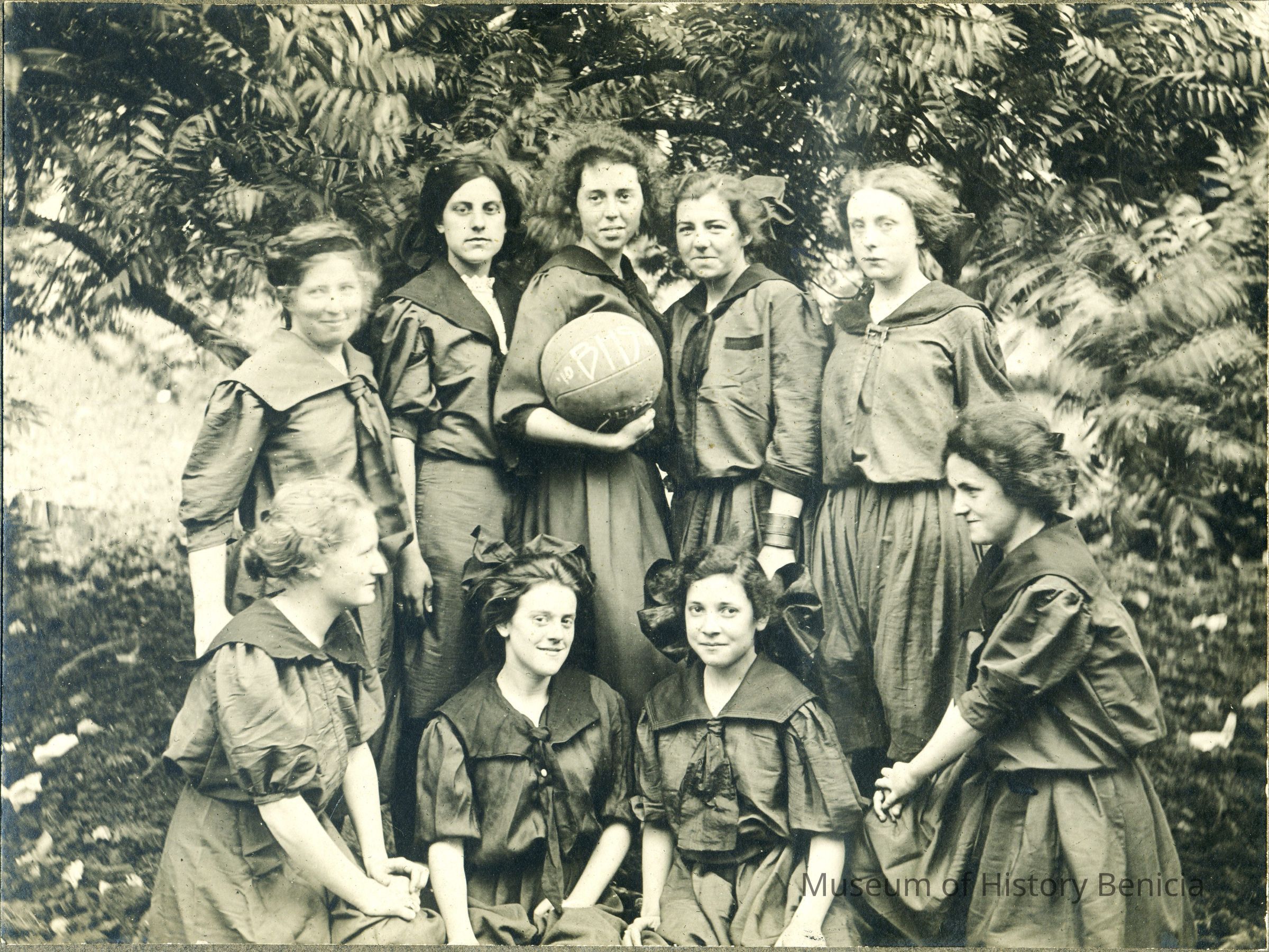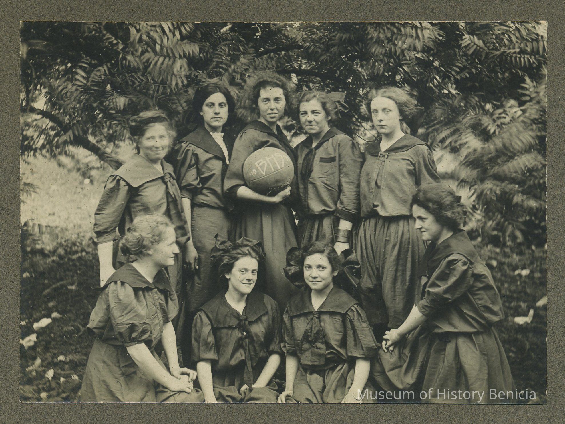 B/W team photograph of the 1912 Benicia High School Women's Basketball Team.