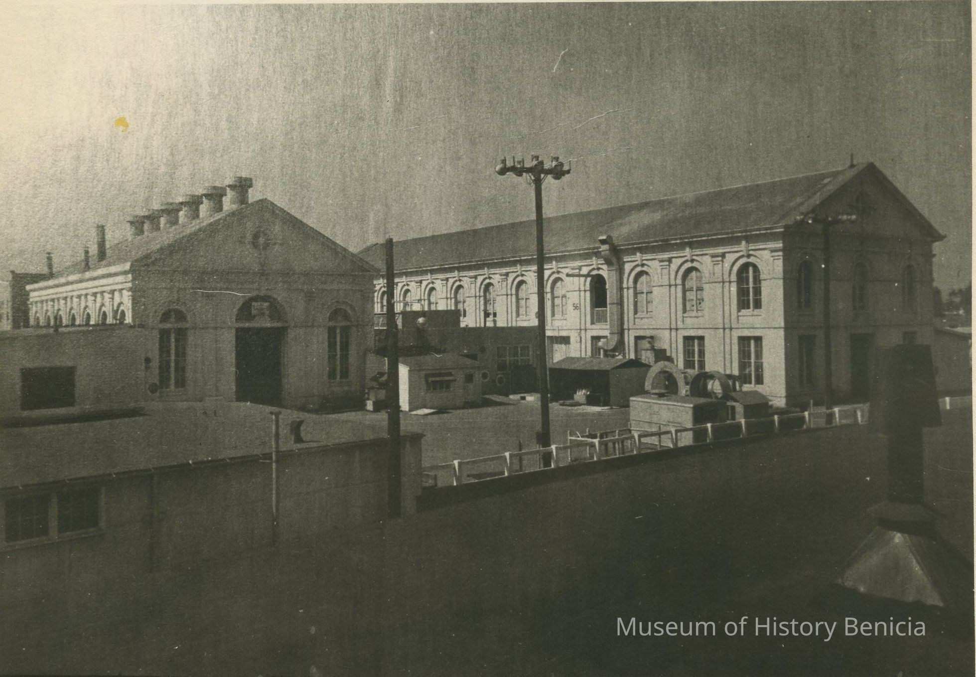 B/W photograph of Benicia Arsenal blacksmith shop built in 1879 and leather shop built 1884