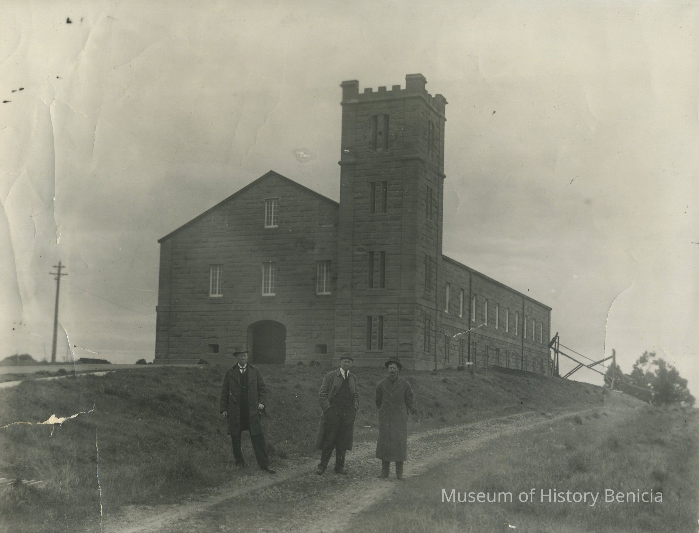 B/W photograph of Benicia Arsenal Clock Tower (post explosion); three men are posing in front of the bulding - on the back in ink is written "left Judge Crooks".Collection
