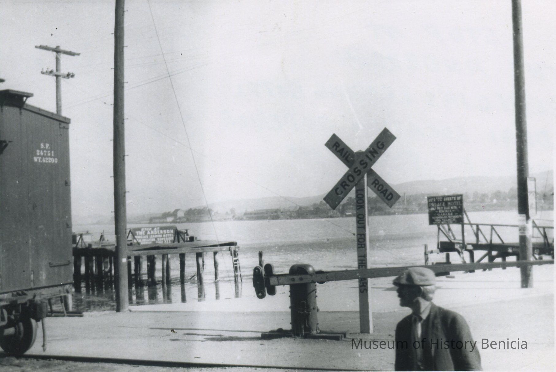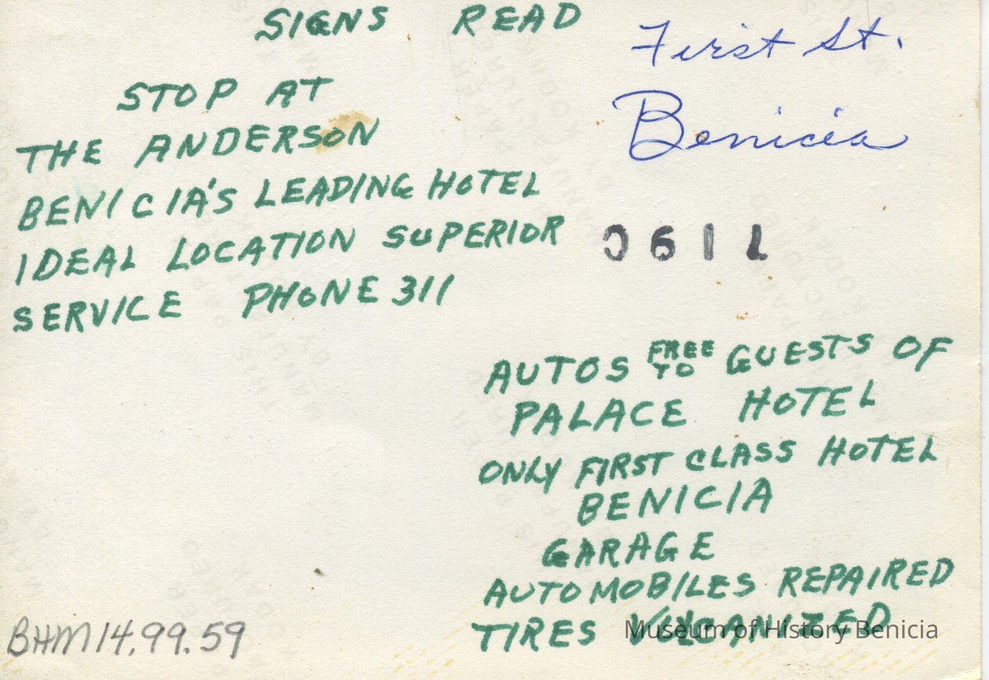 B/W Photograph near the lower end of First Street, Benicia, looking north towards the western end of Benicia. The signs read: (per writing on reverse side) "Stop at The Anderson Benicia's leading hotel / Ideal location / Superior service / Phone 311" and "Autos free to guests of Palace Hotel / only First Class Hotel / Benicia Garage / Automobiles repaired / Tires Vulcanized"Collection
