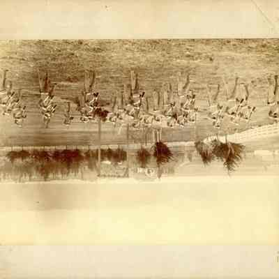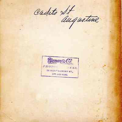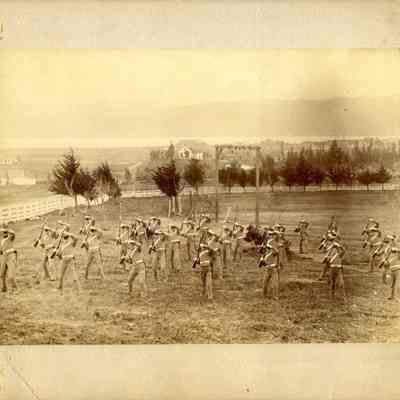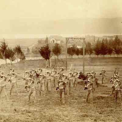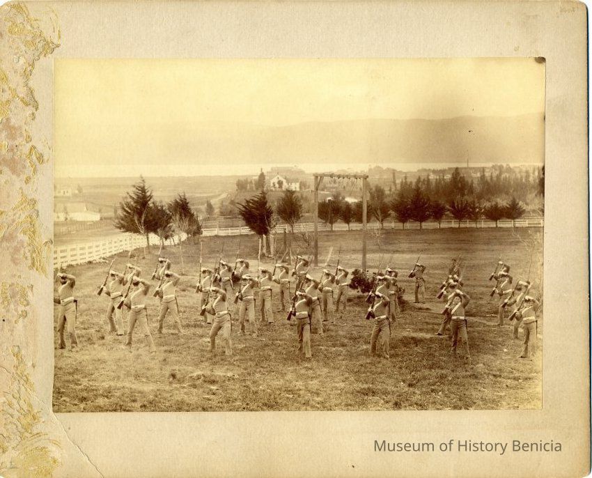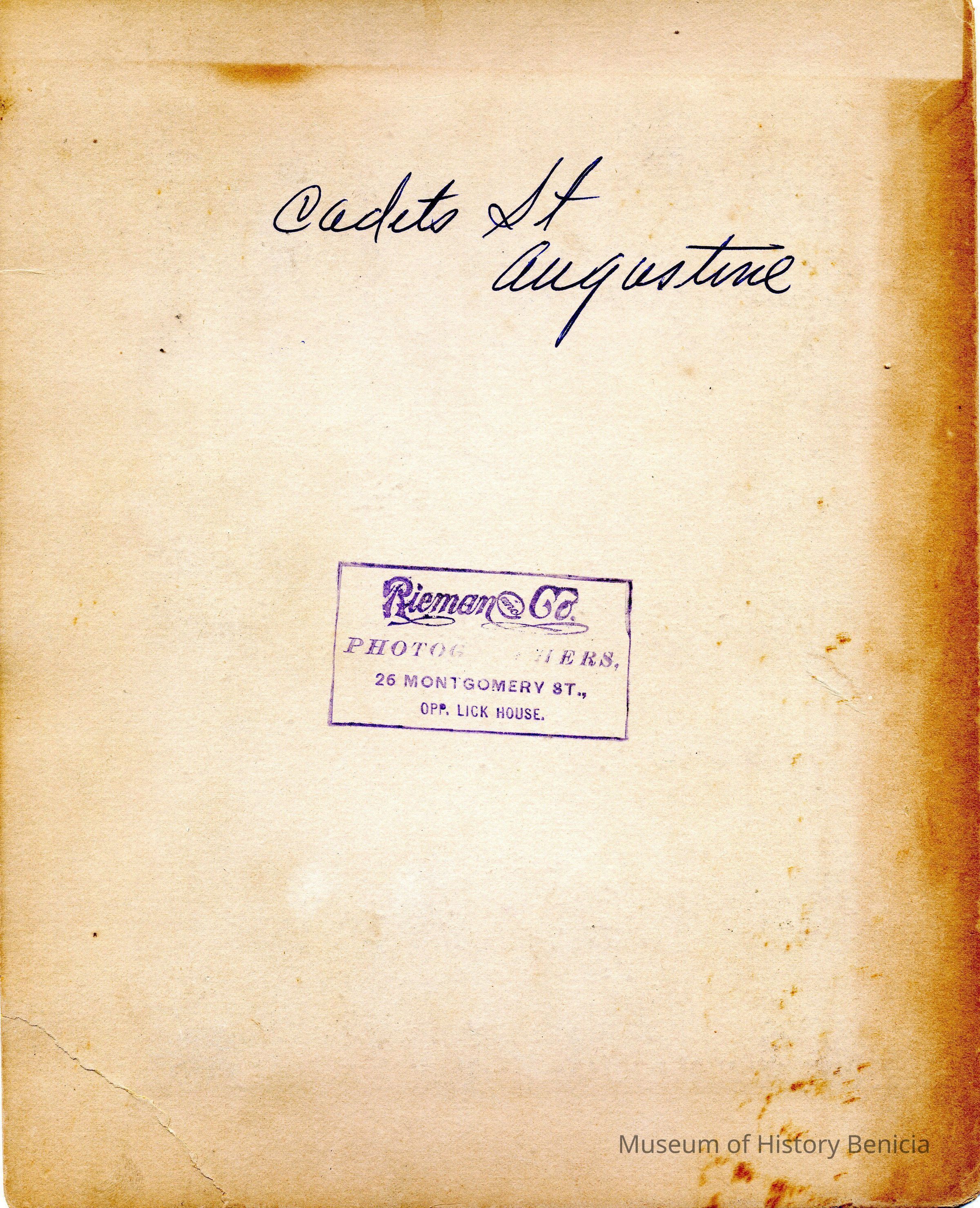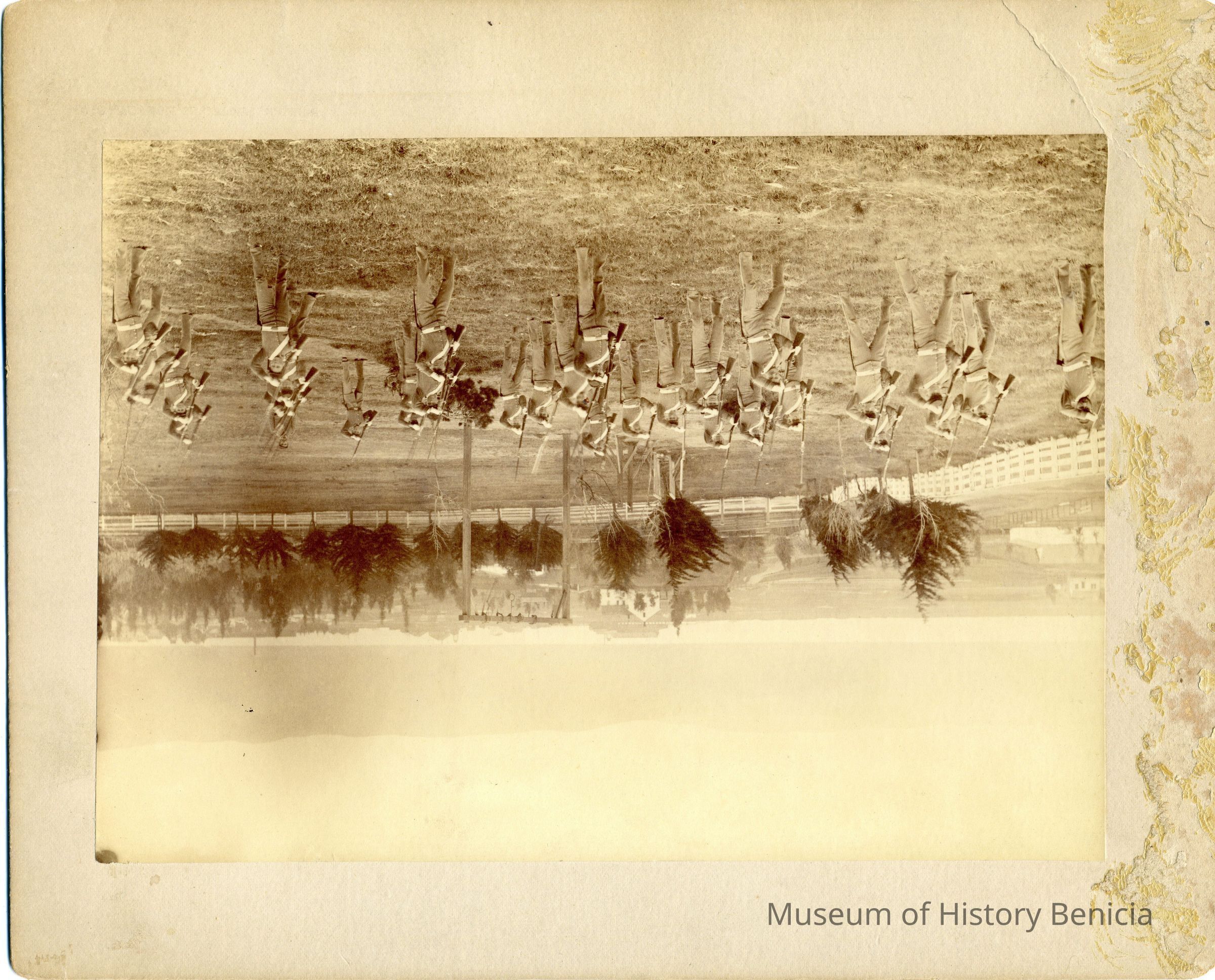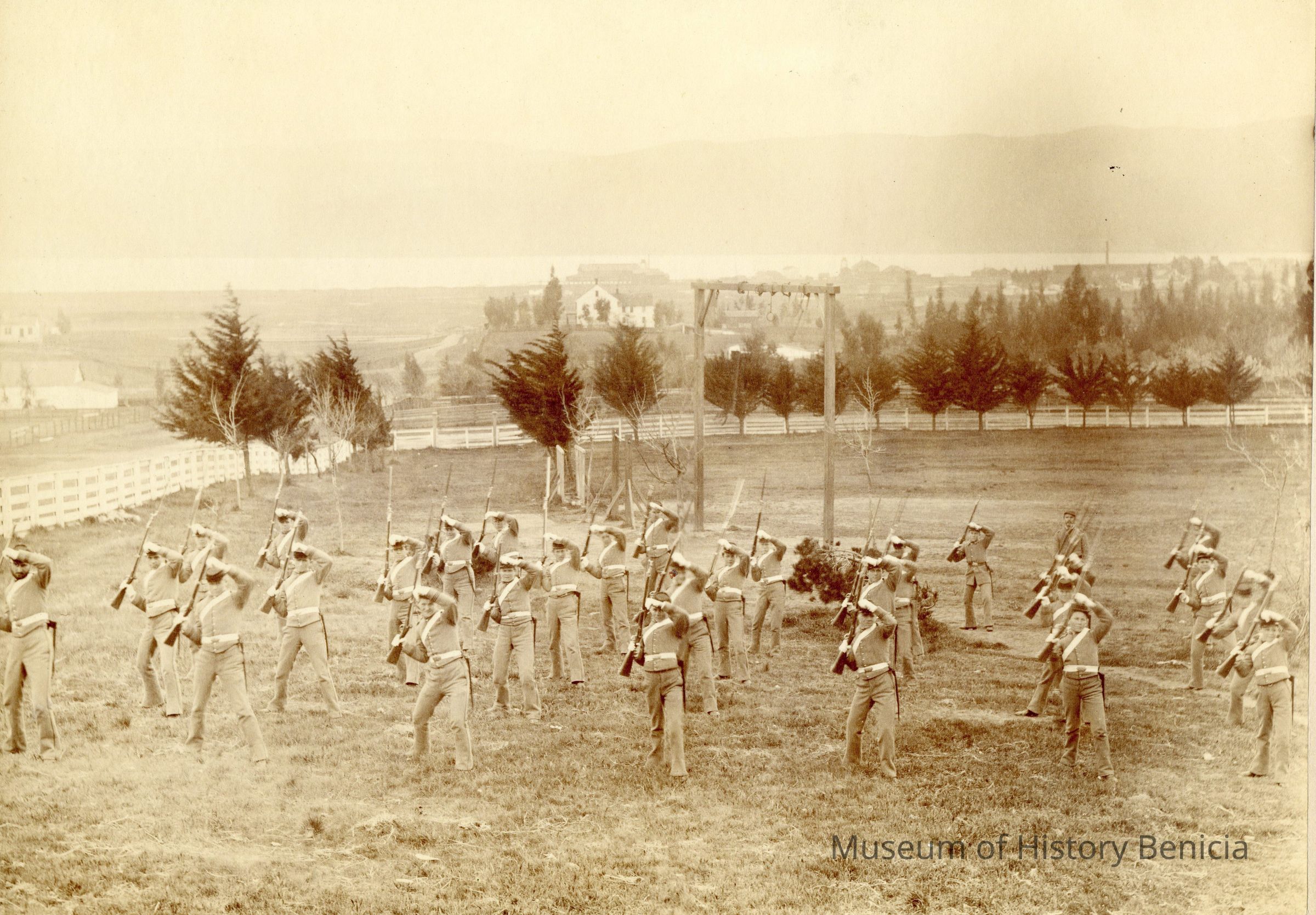 Photo of the cadets at St. Augustine Academy. They are in a field and holding their rifles up in the air, The view shows the Carquinez Straits. The photo is 5.75 x 8.25 mounted on a 8 x 10 cardboard.Collection