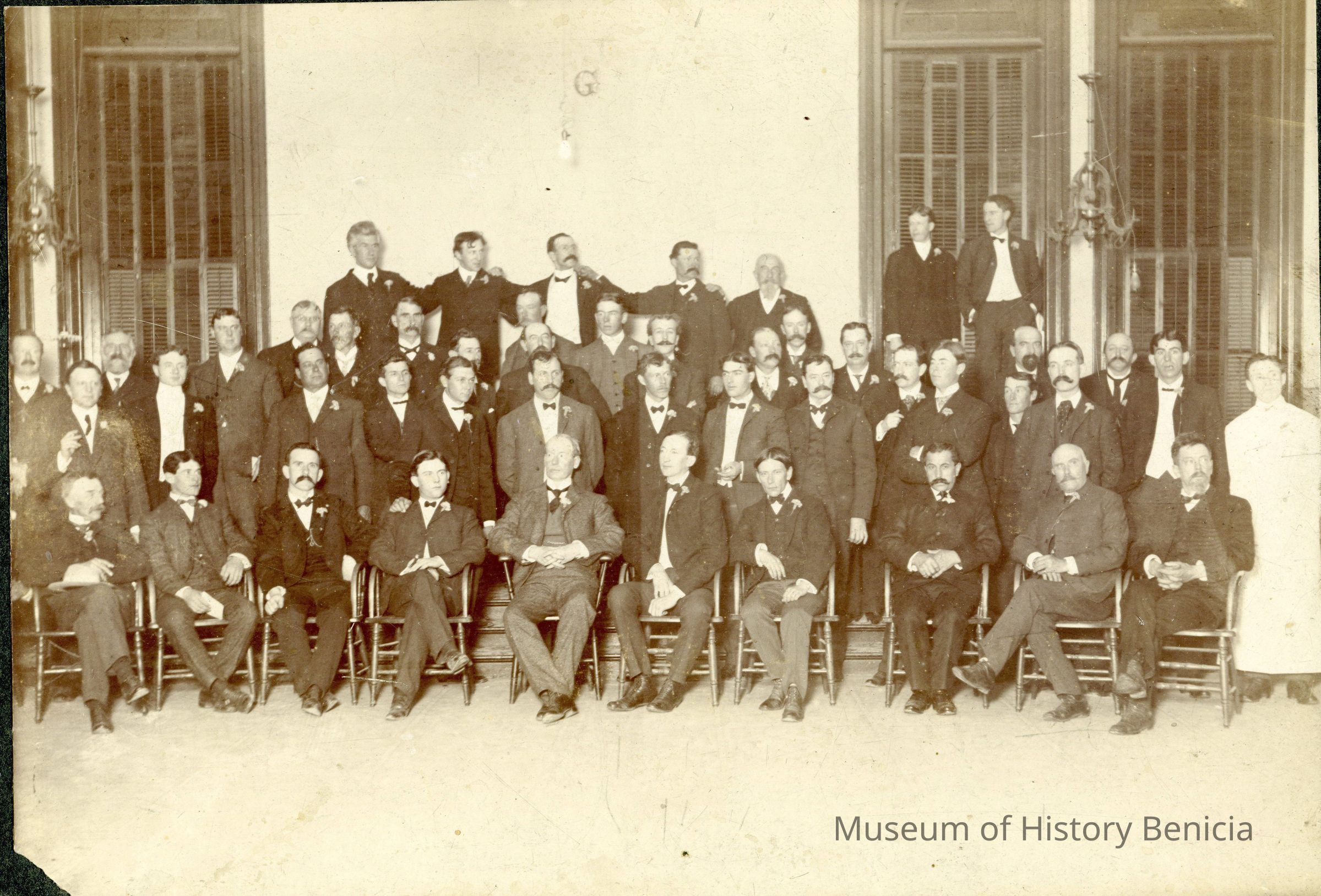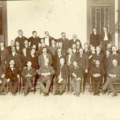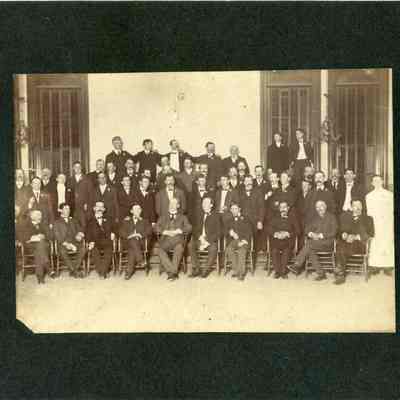 Photo of a group of men. There is no identification as to who the group is or where the photo was taken. The only identifier is the name L.B. Cooper written on the back. All oif the men have a carnation in their lapel. There is also a letter "G" on the wall behind the group. This looks like part of the photo but it is hard to tell.Collection