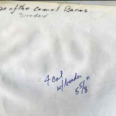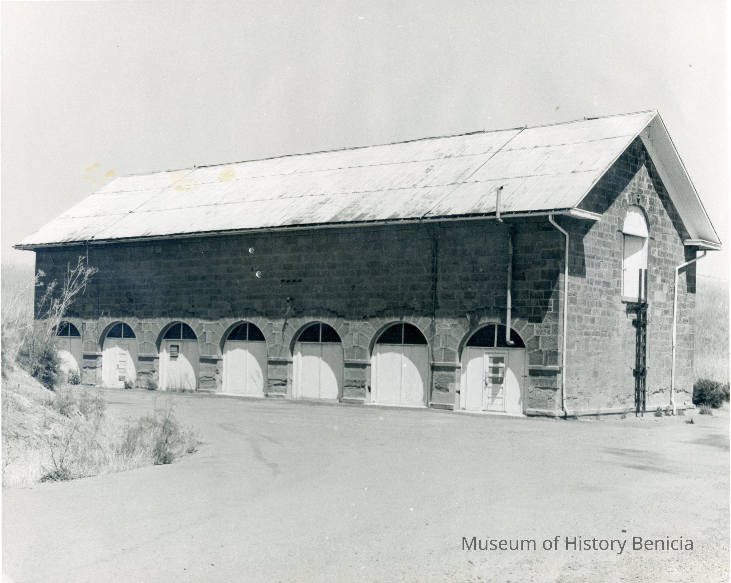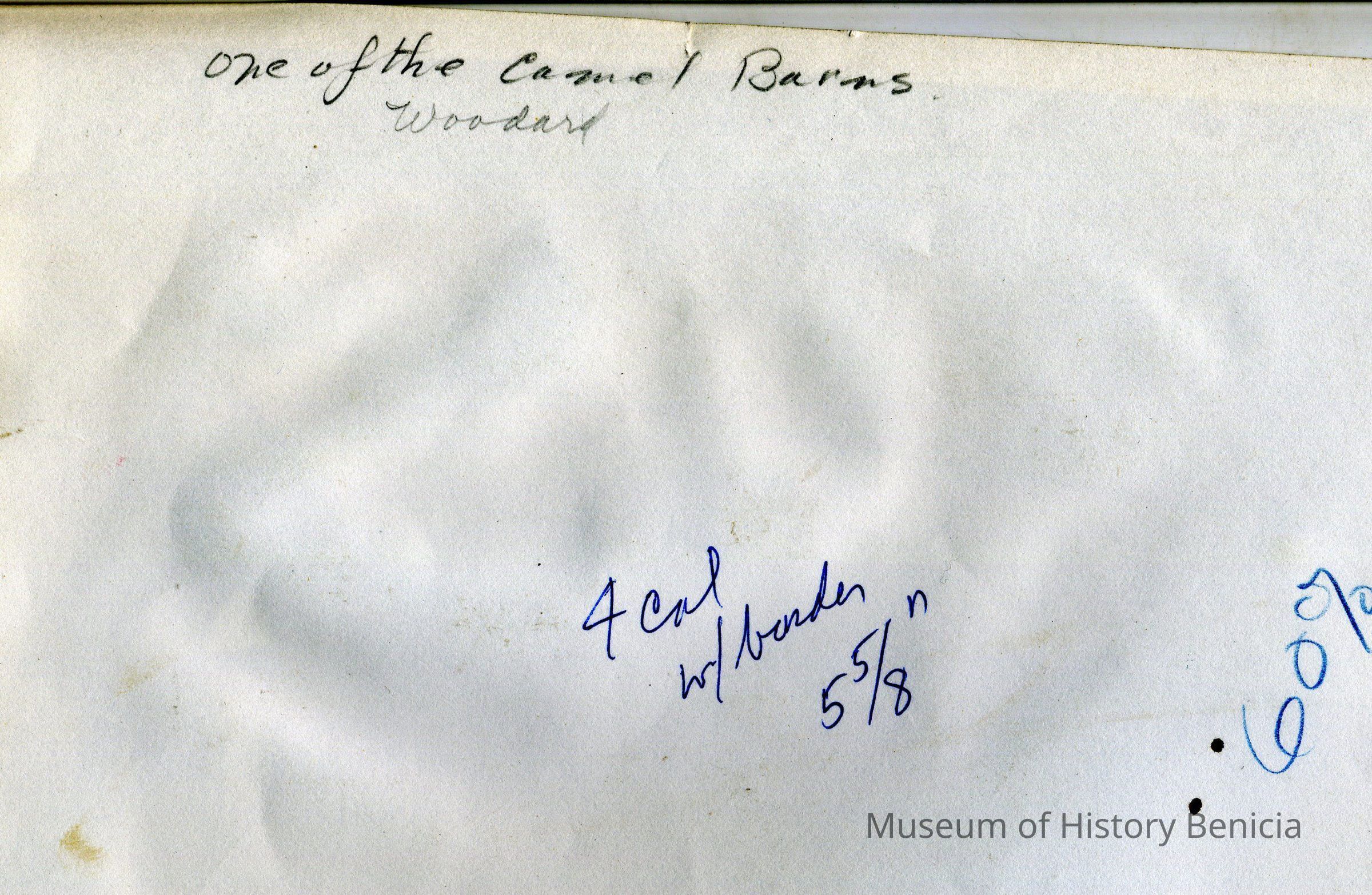 Photo of Camel Barn building #7 built in 1853 where the Industrial Exhibit is currently housed. The back of the photo has newspaper markings for how to print it in the paper and the name Woodard.Collection