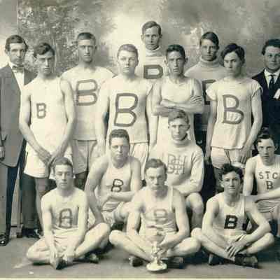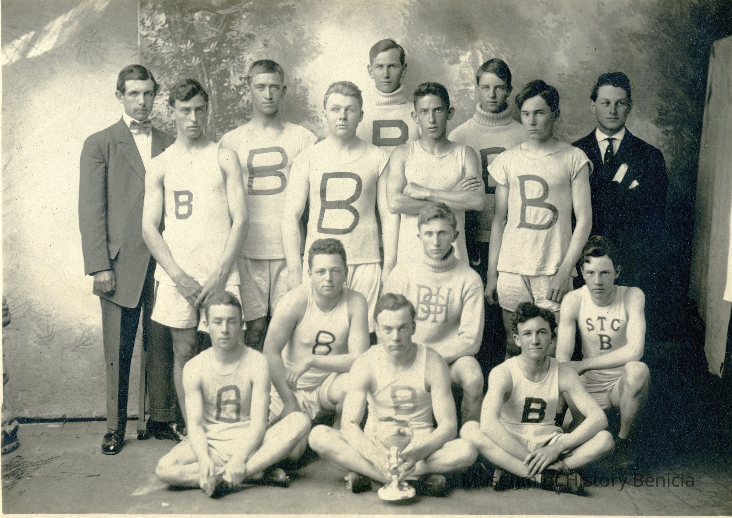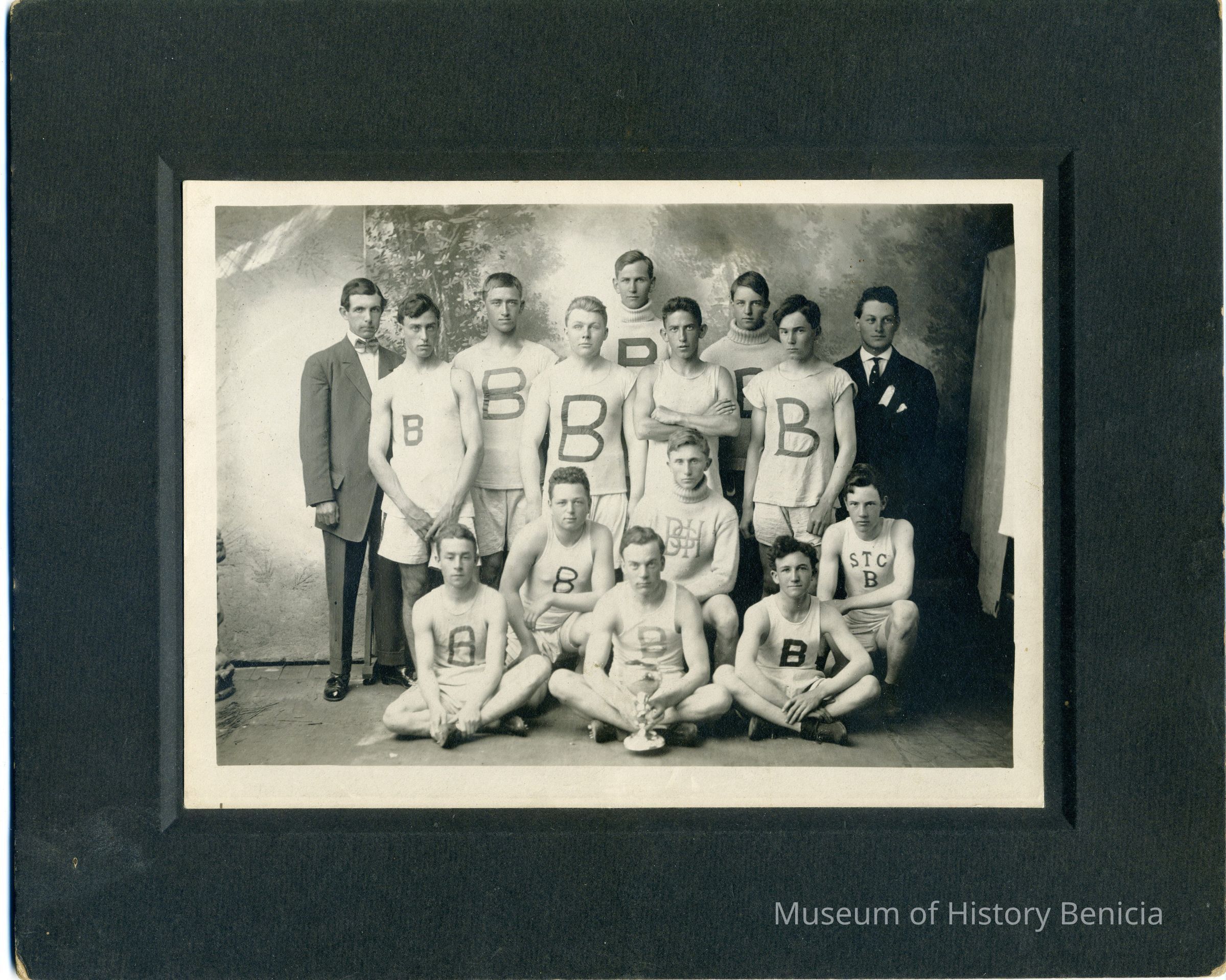 Photo of 13 Benicia students in athletic clothes standing partially in front of a photographers backdrop and two men in suits. They are holding a trophy. I assume Benicia High School had won a basketball tournament. Since this is the same backdrop as in the photo 2014.011.0146 and the same six boys in that photo are in this one, I assume this is from the same 1910 tournament. One player's shirt says S T C, not sure what that means.Collection