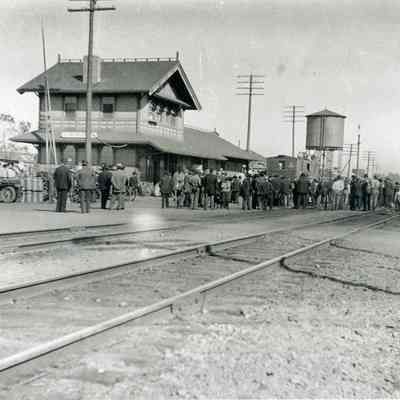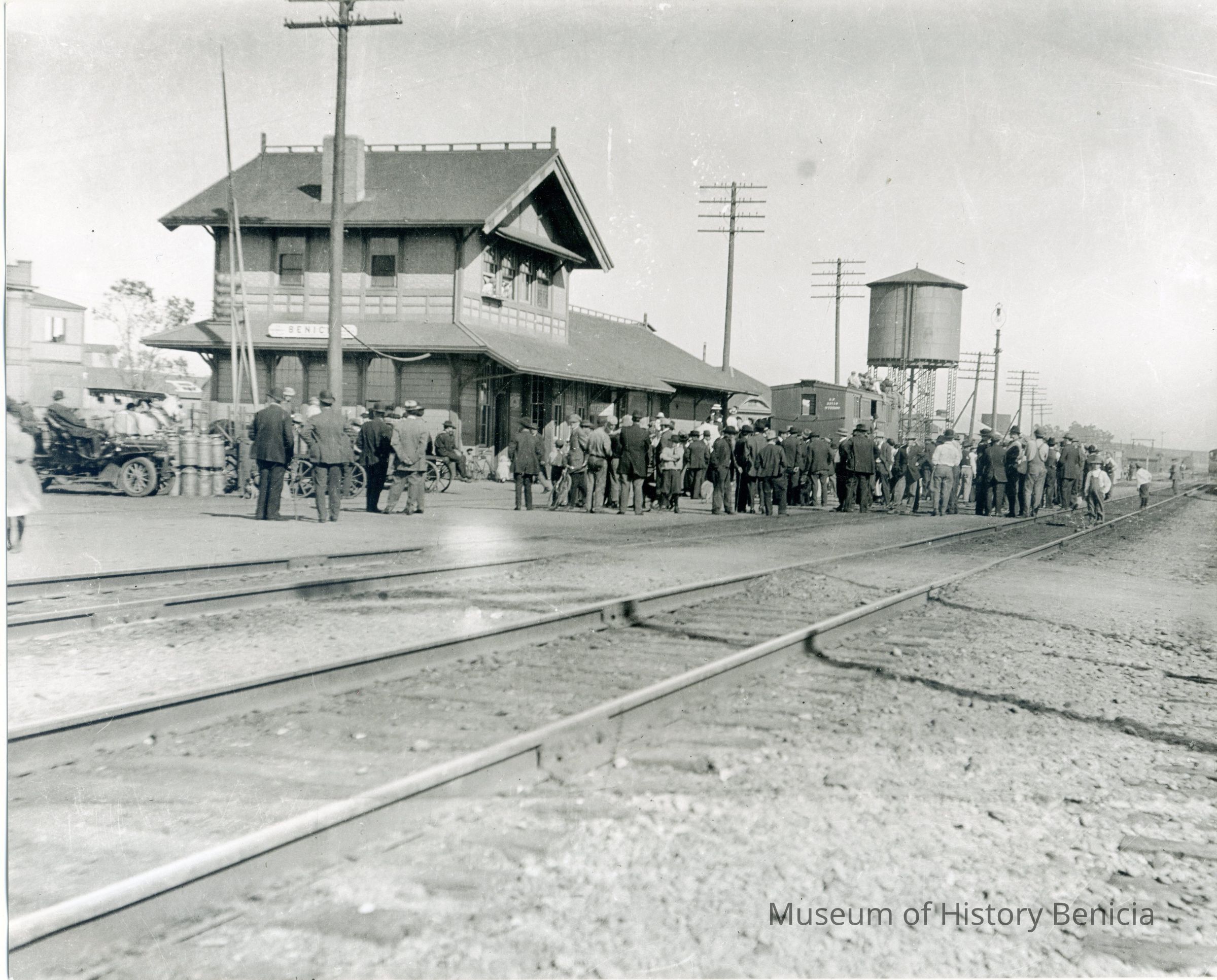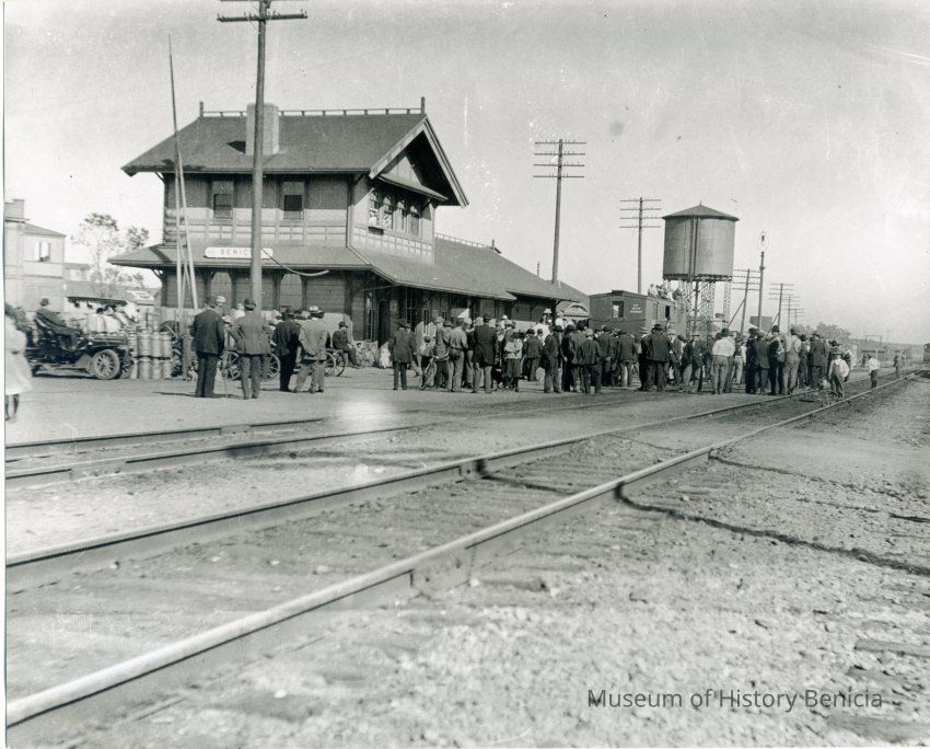 Photo of the train station on First Street Benicia about 1910-1920. There is a large crowd around waiting for something.