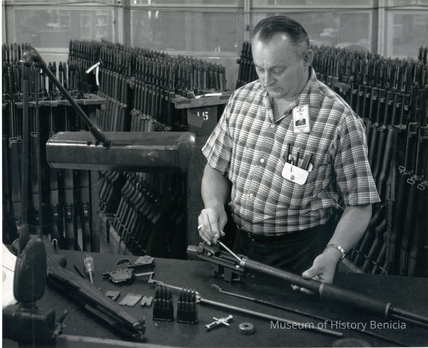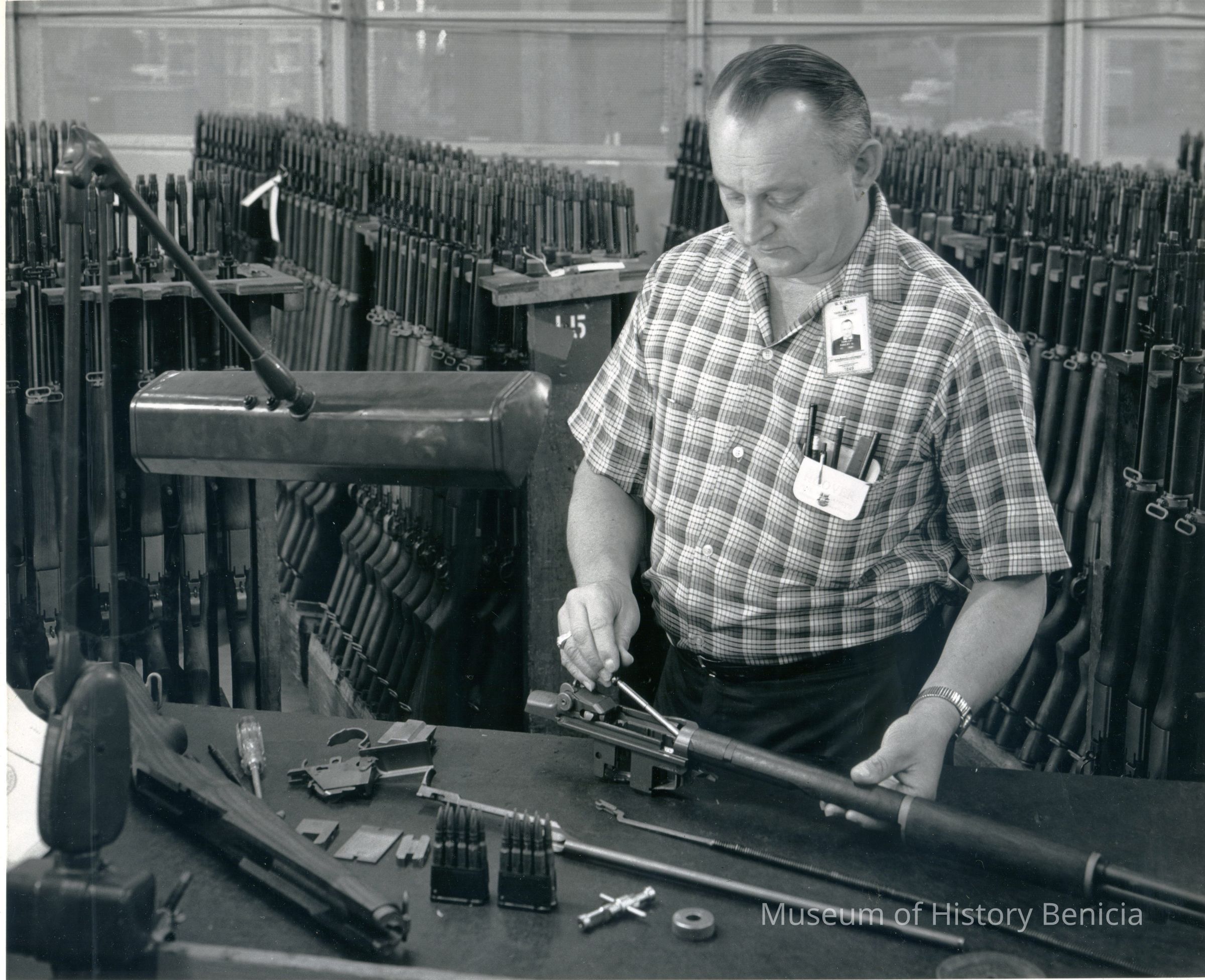 Photo from the Josephine Cowell research material. Shows a man working on the rifle gun mechanism.