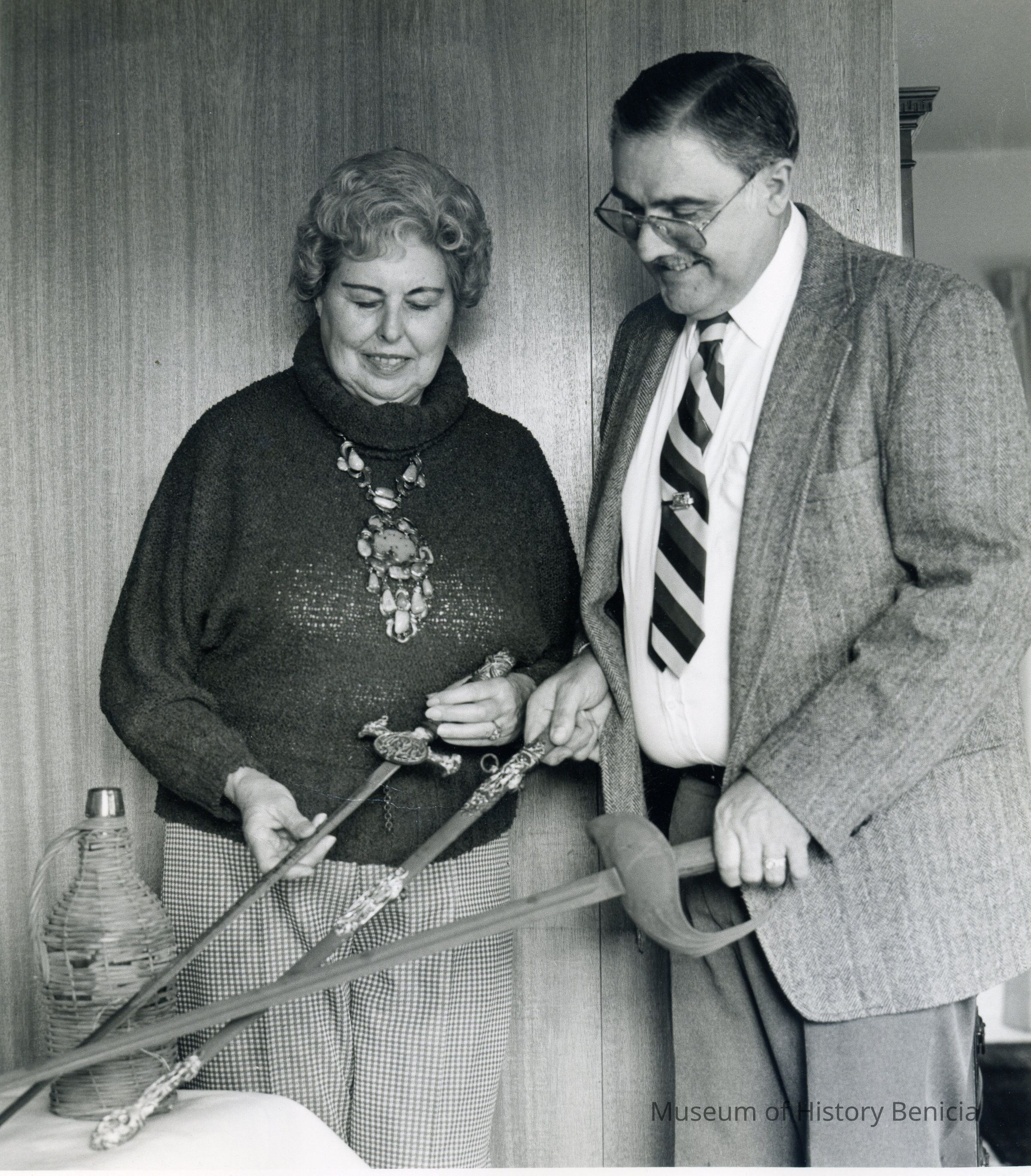 Photo of a woman and man holding three swords and a wicker covered bottle. The woman is Mary McKay.
