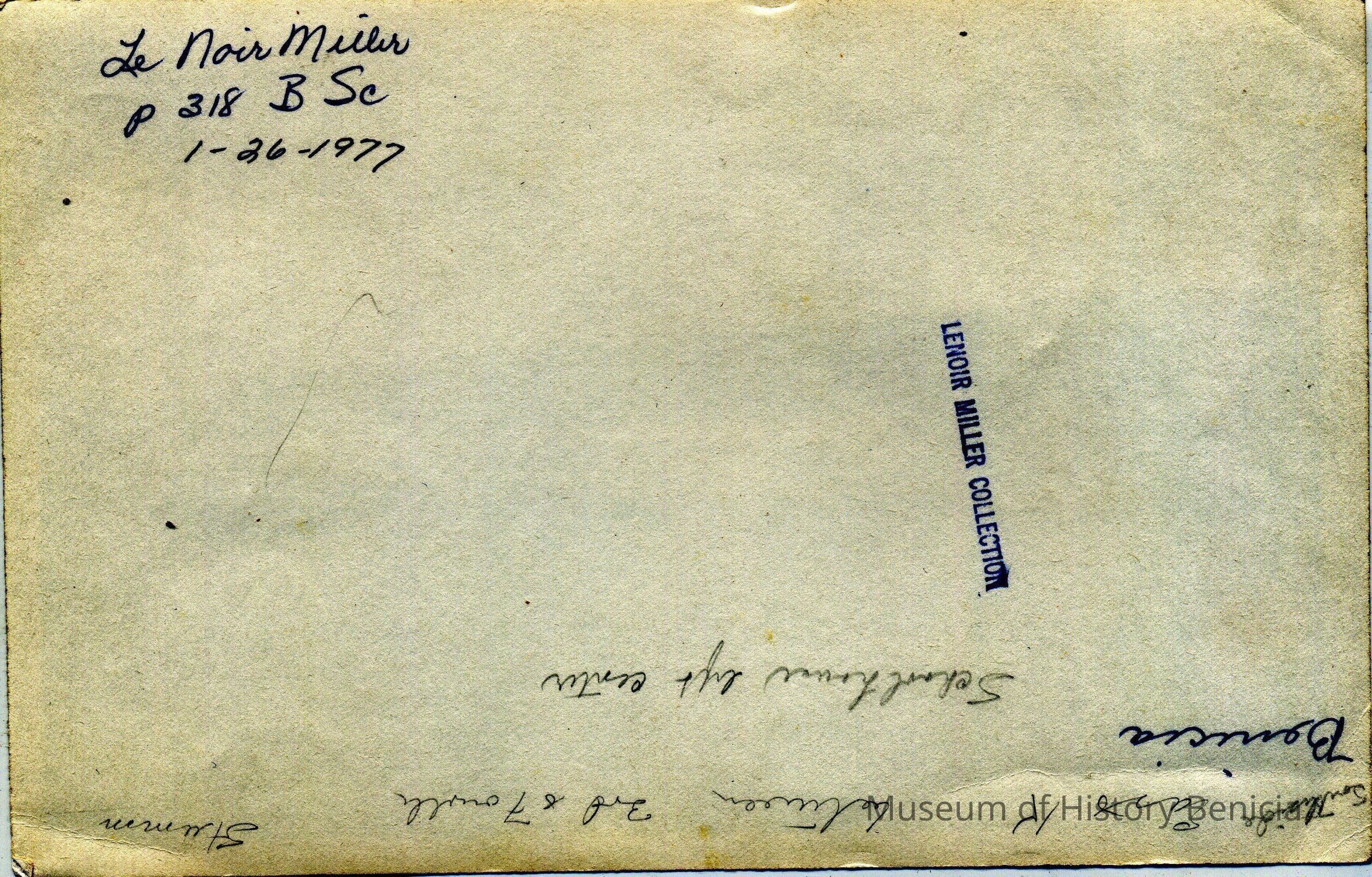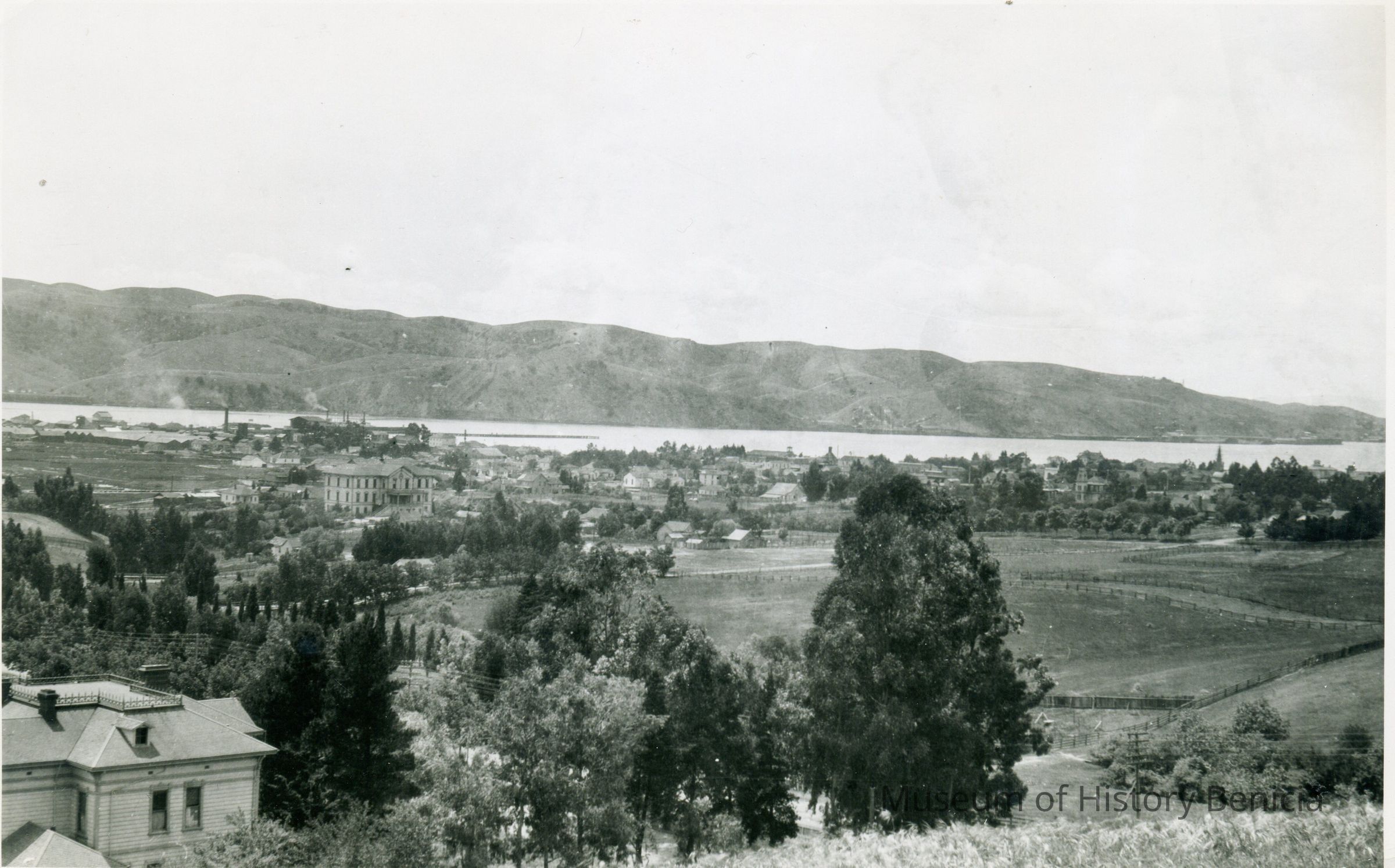 Photo of Benicia from south side East "K" between 3rd and 4th. The schoolhouse is the 3 story building in the center left of photo. On the back it shows that this was part of the Lenoir Miller collection and that the photo was taken by Frank Stumm.Collection