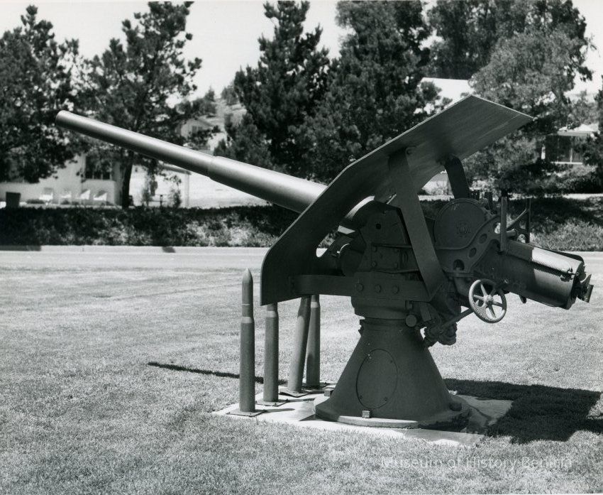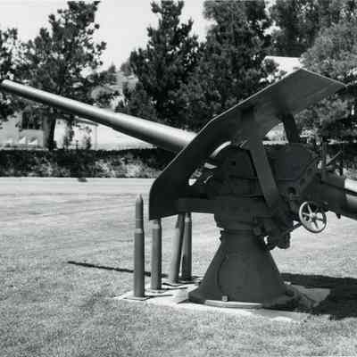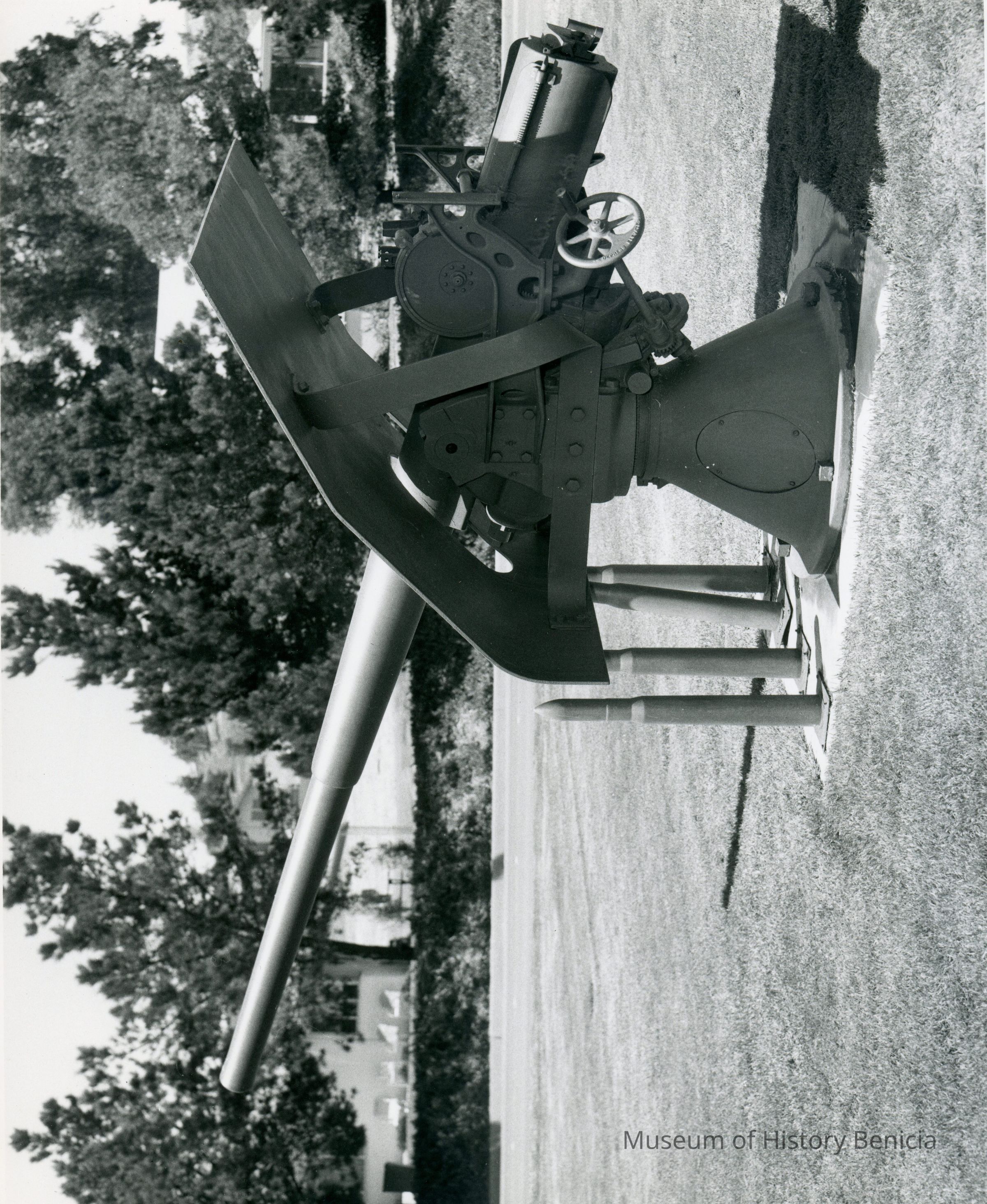 Photo from the Josephine Cowell research material. Shows an artillery piece and shells used as a lawn exhibit.